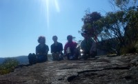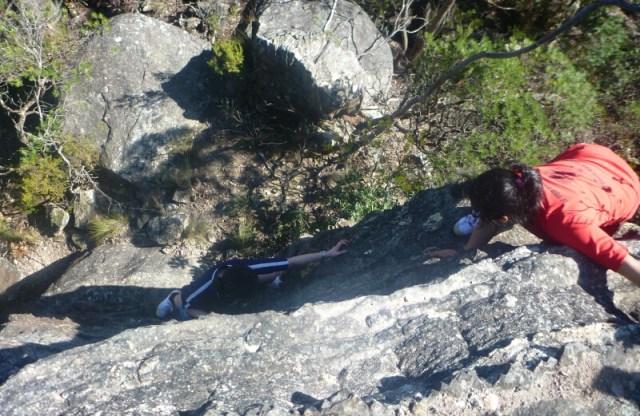 We continued climbing up soon coming to rock-face with plenty of helpful protrusions for holding and treading on. With some free climbing and pack passing, we soon had everyone safely up.