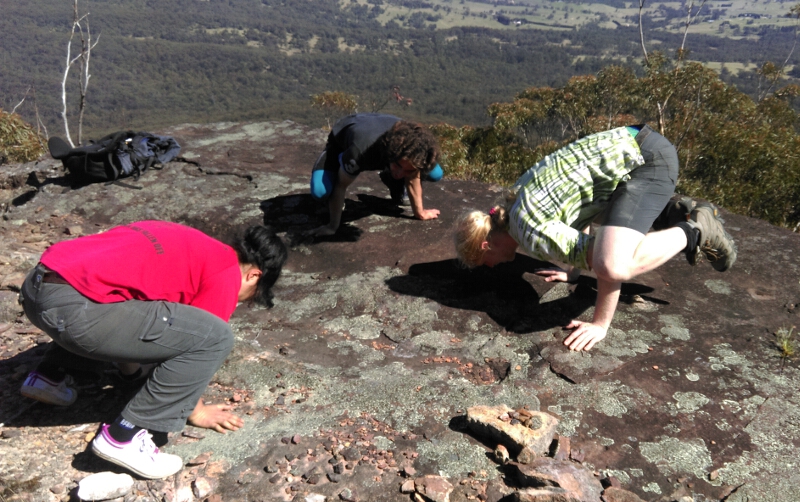 Despite the epic Saturday, the walk had become a bit of a challenge for some, and at sunrise, some of the group rose, and in the cool morning headed through the damp bush before locating the track to the series of chains dropping into the Megalong.