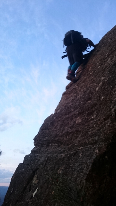 The next pass, named after a local aboriginal, proved a little harder to find… we had someone free climb up one possible pass, but everything was quite chossy, and a rope was soon thrown up in order to get safely down… We lost quite a bit of time here, but soon found an obvious way up. After an easy (but exposed) free climb we where at the top! Light was fading so we would have a short walk in the dark to the road… how wrong we where!