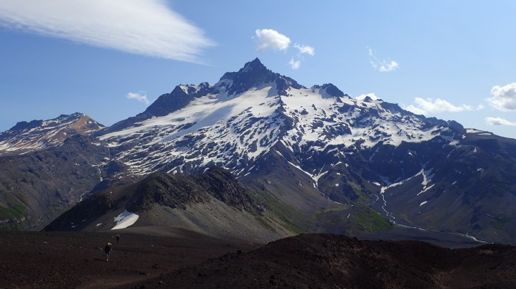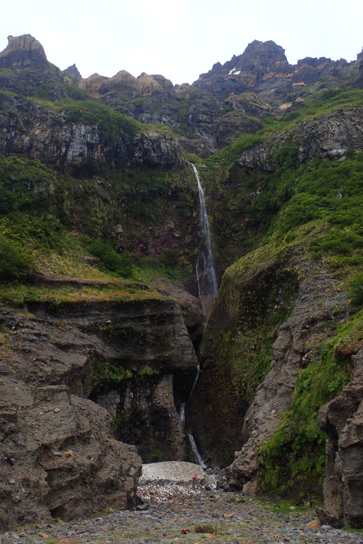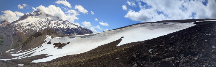 As most people are just day tripping to where we’d camped, this section of the trail is much harder to follow. .. Roughly sandwiched between the slag and river we followed the black sand trail and occasional cairne towards the pass. The river was melt-water from another glacier on Velluda’s other flank. As we passed this valley we discussed carrying water up, but with lots of snow still visible around the pass, I decided we’d be able to find water. Near the top, we managed to find a convenient spot to collect some! A small stream was running beneath the strip of snow. Part way up I enlarged a hole, created a small dam, and Mum scopped water up to fill our bottles.
