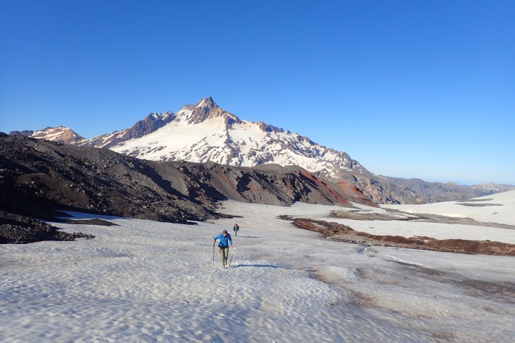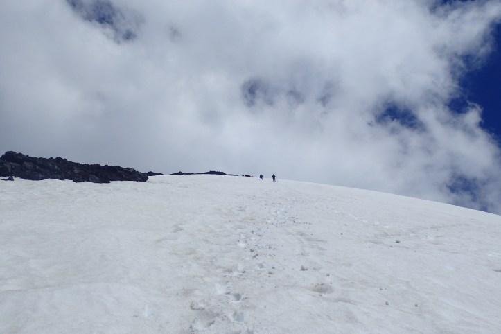Clouds began drifting by and after some final sightseeing the clouds enveloped the summit. Time to head down. The sun had softened the snow, and we decided to try descending via the SE face. It was steep but by kicking in your heels we could make steps and get by without crampons. I went down much faster, especially because I glisaded much of the lower flank using my sick as a paddle Russian style. I passed what must have been a commercial group (outfitted with crampons) just before a rock band and relaxed as my parents descended (30mins).