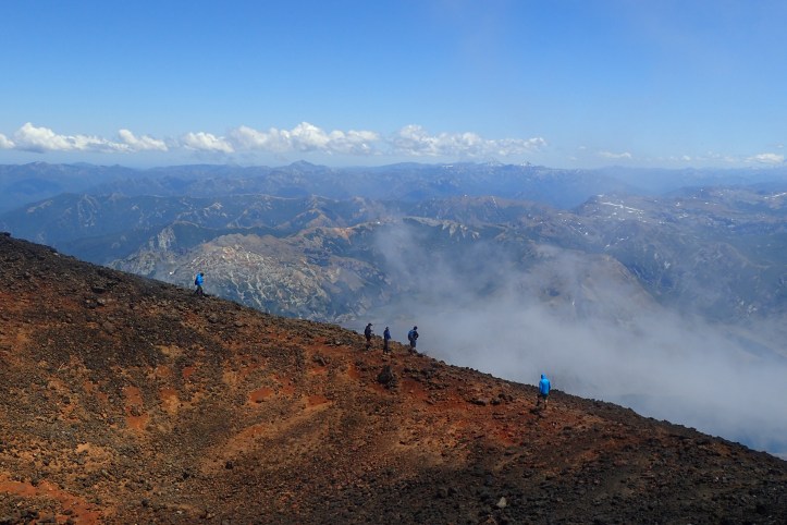 Spiralling up to the base of the primary cone I waited for the others to join me. After a short section of scorial, we made our way up at the transition between the rock and snow. I stuck to the snow at first, in spots kicking in steps with my feet, and sometimes cutting steps with my ‘digging sick’.