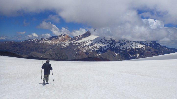 The pass was not far away. I walked out into the cornice and peered down at the trail continuing below. We would have to skirt around. It wasn’t really a problem as we were planning to summit Antuco via its southern face.