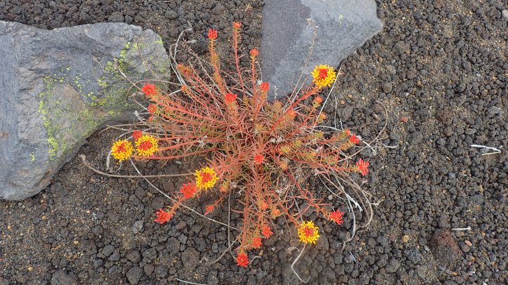 The clearly marked trail led us across a flat bench and then another steep climb to the edge of the volcanic field. Vegetation was notably absent with only lichens visible on the black slag (Jimmy was slagging behind).