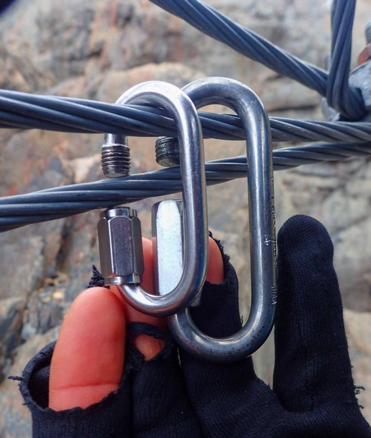 To cross we just carried some tape/webbing to make a harness. Around 5-6m works well for me. I left one tail quite long so I could attach myself to the cable as a backup. I found a mallión worked well – even my small one. Most people carry a steel crab instead, but a mallión is lighter. This safety is a a good place to attach a bag if you are by yourself.