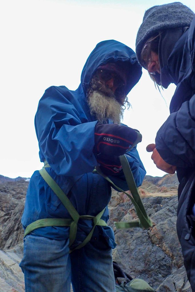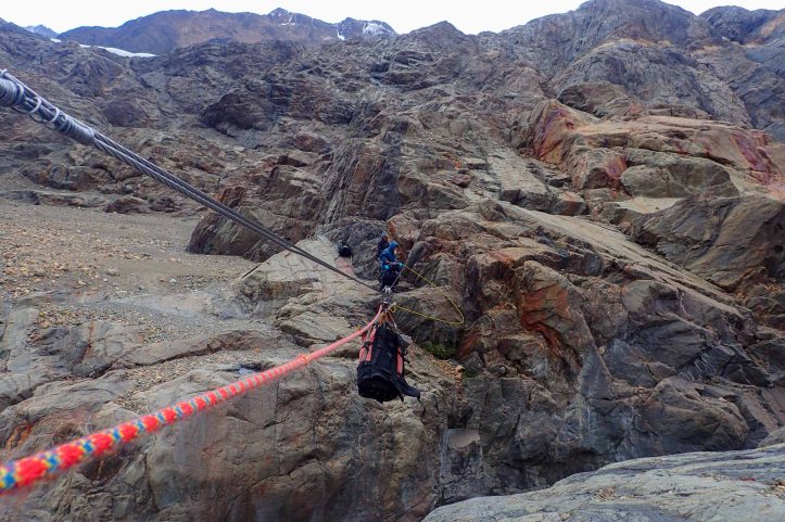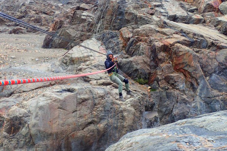 As we rounded the corner to Laguna Túnel we remembered the fierce wind from the previous day; but instead of being blasted by a strong storm, it remained calm. Rounding the glacial lake we climbed up beside the waterfall, which had also calmed down and it wasn’t spraying Felix like the day before. Negotiating the rocks rounded by a melted glacier we quickly made it to the tyrolean.