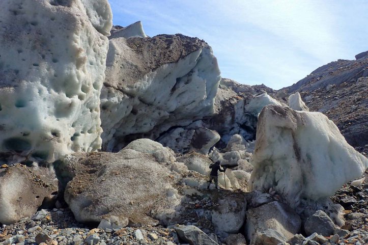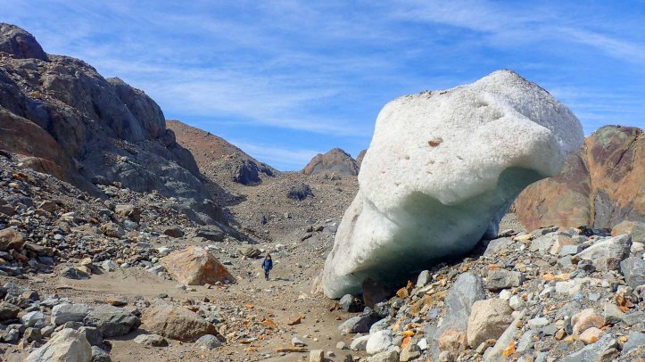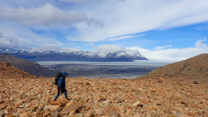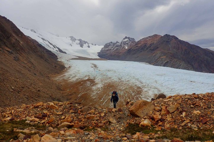 Traversing the lateral moraine we soon dropped down to cross Glacier Túnel Inferior. Lots of rocks had fallen into it and over time embedded themselves into the rock, making it a simple matter to walk across in our shoes.