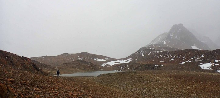 Strong gusts occasionally forced us to pause, sometimes getting close to pushing us off balance. Another false summit disheartened my parents but we were very close. Some more persistent patches of snow from a few days prior and we reached the surprisingly calm pass. Taking advantage of the calmness we hurried past some large pools and reached the far side. Here we could see further than expected, with the clouds racing by, creating periodic windows of relative clarity. Then we entered the mêlée. As we started down the other side the wind was ferocious. We were lucky it wasn’t any warmer. Somewhere just below zero, the snow blew right off mum’s and my puffys… Dad however put on his wet weather gear and – in the process losing us for a time and at some point his pack cover.