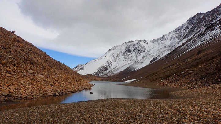 We continued along the moraine, sliding down a steep scree slope to the small tarn above Lagunas de los Esquíes. I admired the view through the gap out across the glacier.