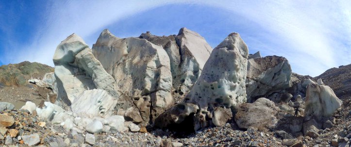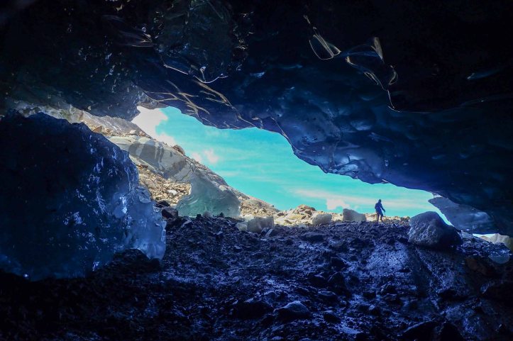 Dropping down to the lake, I was surprised that it barely existed. Perhaps it was actually a jökulhaup? Or maybe the water had finally carved a faster way down to the lake? Whatever the case -what showed a lake on the map was now two separate pools with a significant climb between the two. We walked around some very big chuncks of ice exploring a little, but the ice wall which was the edge of the glacier put me on edge so I didn’t stray close. We ventured over to the other disjointed lake and wandered a little way into the large mouth of a glacier cave, a river disappearing into the darkness. Quickly exiting under the arch of ice we walked up into the mouth of the glacier exploring the cracks, moulins, noises and crevasses. A large boulder marked our turnaround point.
