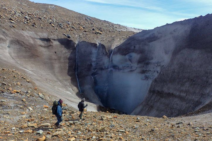 Climbing up beside a spraying waterfall I negotiated the rocks rounded from a now receded glacier. Soon the tyrolean came into sight. It was much shorter, lower and overall much less impressive than I’d expected. There were two small cables and our mallións fit over them easily. It was going to be a piece of cake, I didn’t understand why everyone made it sound so difficult? But I need to remember that many walkers likely don’t have a canyoning/caving background. There was a pulley on the cables, but because of the rope attaching it to the other end, gravity wasn’t quite strong enough to take it across. Just upstream of the gorge were open alluvial flats and it looked like here too would make an easy place to cross (traditionally people crossed at the delta).