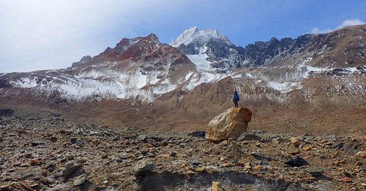 Quickly, we again regained the lateral moraine. Climbing up a ways we sheltered below a large rock next to stream for lunch. I was hoping Mum would trigger the stop, she needed a rest. By the time we stopped, she was already grumpy and low on energy. I was glad I hadn’t waited longer.