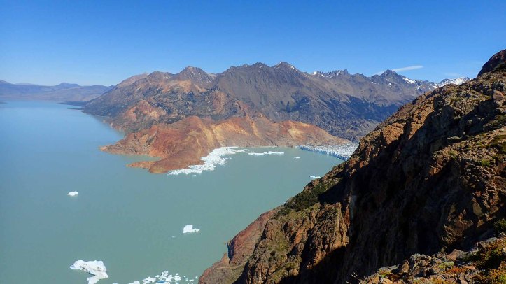 We stopped just before Paso Huemul to top up on water and then dumping our packs headed off to the Mirador del Cóndor. Jimmy quickly bailed at the first rise; he never seems interested in these short side trips. Mum and I however were very pleased when we reached the cerró. Panoramic views greeted us, from the lake past the retreating toe to the sweeping striated glacier. An amazing place to enjoy our banana chocolate cake, and in my opinion, the highlight of the trip. I could have spent the night there.