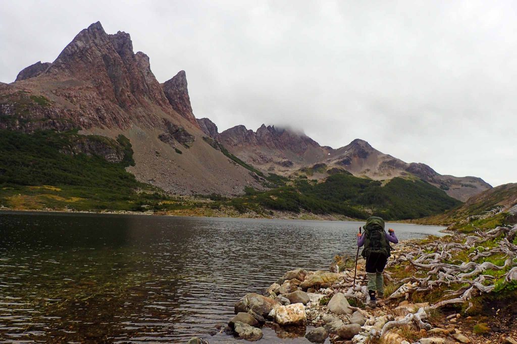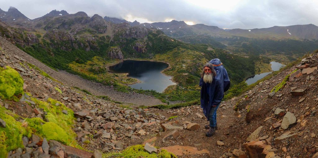 Mum had been talking to a couple of Americans and found it amusing when I commented on the easy day – right after they had complained about its difficulty. Perhaps this stemmed from the mud and the fact we had deviated from the official trail números times. Whatever the case, our rest was accompanied by several of their angry shouts as they headed up the side of the valley, one of which strangely sounded like a cow. When we resumed, I led us up a clearing before the marked trail. We had an easy time making it up to treeline with zero mud and cut back across to the track below a small bluff. Climbing steeply up we gazed Northwest (along the Beagle Channel) to Ushuaia and the Cordillera Darwin and then crossed a small stream before the final climb up to a barren sloping plateau. I thought about a side trip to the summit, but in the end, simply continued on to Paso Virginia, where the ground suddenly dropped down to Laguna los Guanacos. Mum was already a dot most of the way down the scree. Jimmy and Sis headed down with the Americans via a precipitous track. Lose rocks on a hard surface. I didn’t like the look of it. Whilst the others edged down, I contoured around eventually gaining the ridge. The remains of a hidden glacier surprised me as I surveyed the valley that had suddenly appeared. Having my fill, I scree skied down making very good time in the almost perfect rock pack. As I dropped down, I wondered why the route didn’t take the gradual ridgeline down? It seemed safer, would cause less erosion, would have better views… I guess there must be a reason. I waited a while by a small stream running into the lake, looking around for any guanacos. On Isla Navarino’ they are supposed to be «larger and heavier than those found on the mainland (or Fuegian). This appears to be the result of the absence of predators – even the Yagán people were predominantly seafaring nomads, less skilled at hunting agile land prey. Unfortunately, runaway dogs seem to be causing a rapid decline in their numbers.» This may be why we didn’t see any, but to be honest it didn’t seem like an overly accommodating location.