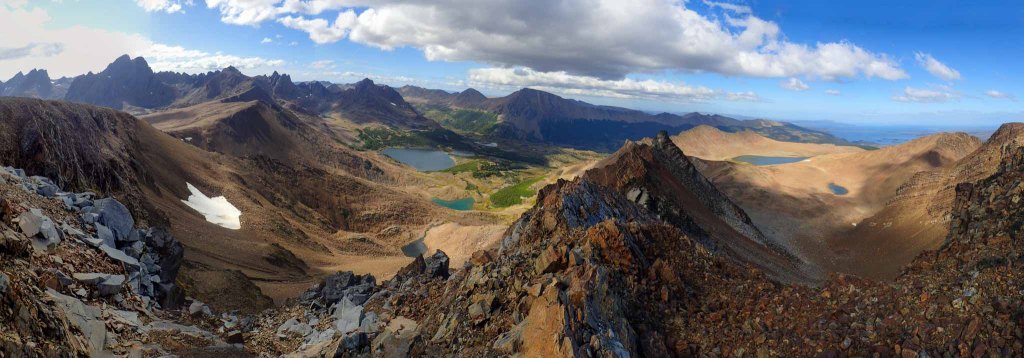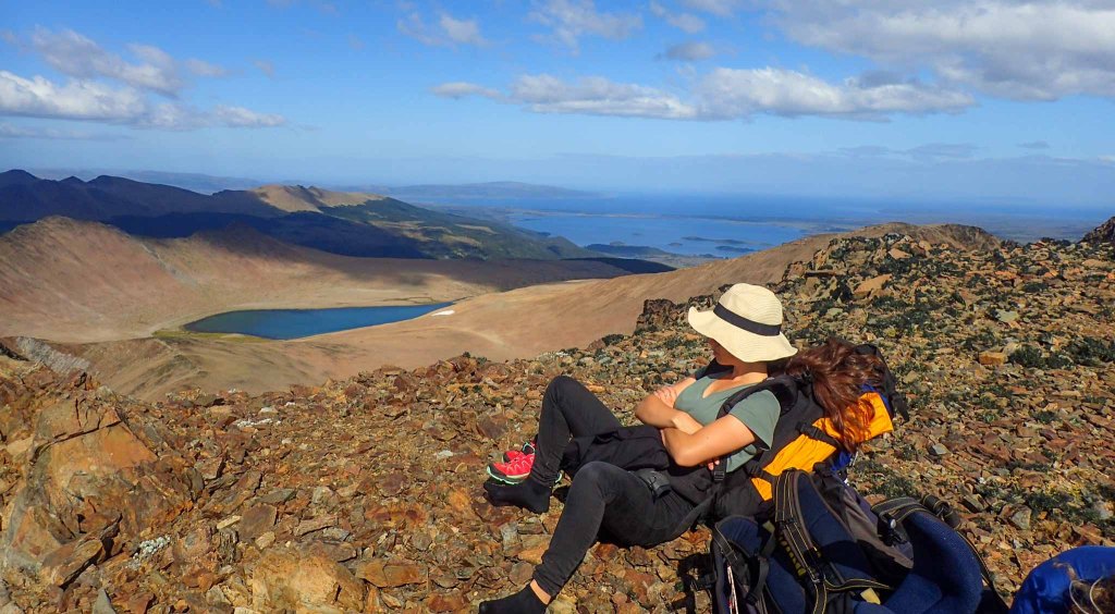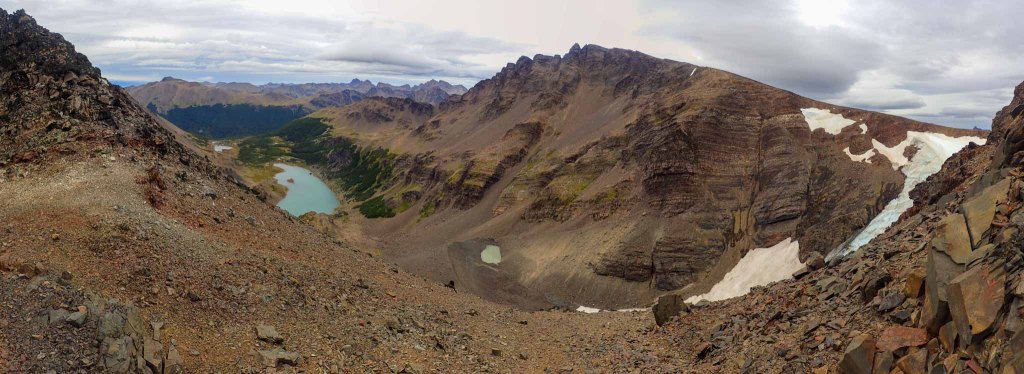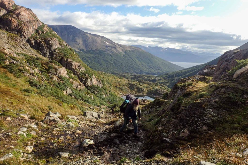 We woke early with a long day ahead of us. After walking to admire the views from the unsightly lookout I quickly returned to save the other’s tent from being blown away. We then continued to the other side of the lake climbing up beside the salto that the lake gets its name from. Reaching a flat area, we passed a couple who had camped up here in solitude. I waved to them as I passed and we’d actually run into them again in the future. Another steeper section led to a second flat area with good views almost everywhere you looked. From here we swung left to Paso Australia. There wasn’t anything remarkable about the pass and I have no idea where the name came from. I was going to ask in town, but forgot. Taking a moment to gaze over Laguna del Paso, we slid down a patch of persistent snow and scrambled around to the nearby Paso de los Dientes. The views were spectacular. Bare craggy mountains nesting a tarn amidst the scree. In the distance more lakes, and, as Nam was happy to see, vegetated spongy lowlands falling away to Lago Windhond, the ocean, and even further afield the hazy Cape Horn Islands.