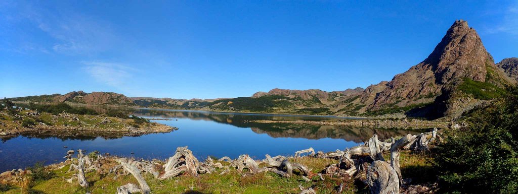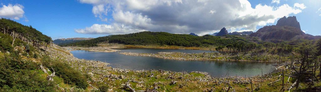 Soon we dropped down, the towering Picacho rising to our left, apparently the highest ‘tooth’ of them all, though the maps I checked awarded it differing altitudes. Down around Laguna del Picacho (and yet others!) to reach the large signposted cairn and junction. A number of people were there snacking, and consulting maps. I searched around for a suitable place to camp or cache some gear. Most people will head right at the junction, continuing the Los Dientes circuit; however, we were planning to tag on the two day side trip to Lago Windhond. Happy to leave the crowds behind, we passed an Australian girl just down from the junction – she’d gone the wrong way. We’d met a couple of times already and we chatted a bit more as she lunched on her ‘flying carpet’. Soon after, next to some large boulders, we found a suitable place to camp (for when we got back), complete with old fire rings. It took a while to sort out gear, but eventually we had a large bag of food which I suspended from the top of one of the more convenient boulders; whilst mum found a place for the less tasty (non edible) things to be hidden in a small talus cave. That done, we dropped down to pass lakes lined with pale rocks and gnarled wood. Many of the trees had beaver chew marks, and around the circumference of all the lakes was a ring of dead wood, white like bone.