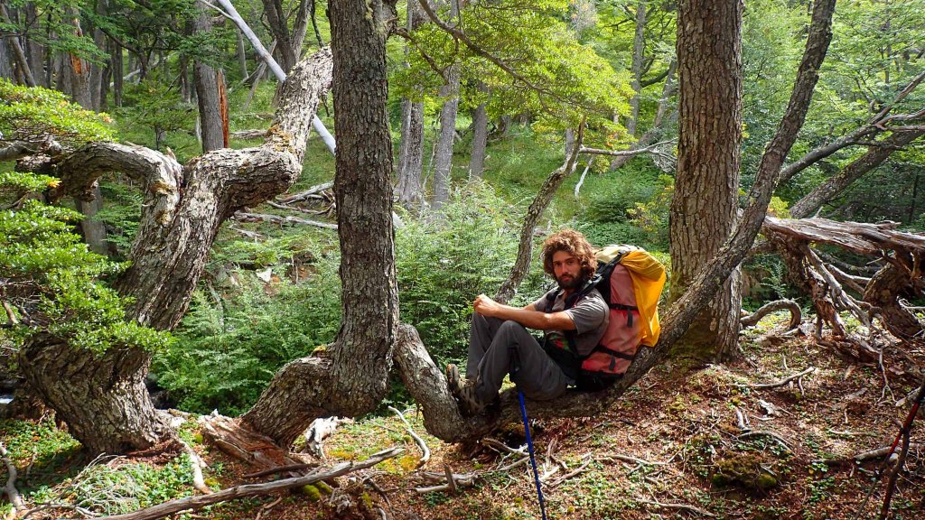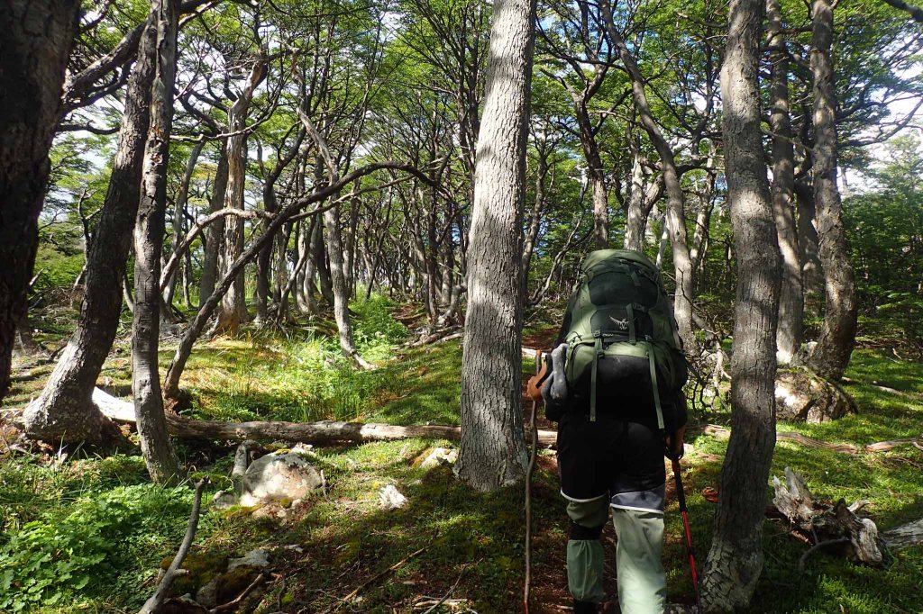 I headed off to buy some cheese (2.5kg) and scroggin (1kg), both not quite what we wanted but I hoped it would do. By the time I got back, the others were clear, and we had confirmation we could cache gear with the sister ferry company across the road. We repacked and left a couple of bags before heading out of town towards the trailhead. Jimmy was carrying my drybag – we’d cache it somewhere in the woods close to the airport just in case we got back from the walk a little later than expected. We had a day less than I would have liked but it should still be manageable. The best case scenario was that we’d make it to Laguna del Salto that night and push on all the way to Lago Windhond the following day. Then we’d have plenty of time and could take it easier. Reaching the park, Dad and I headed off to the airport junction to cache his bag. We found a good spot under a log by a large stump. Camouflaging it with some bits of bark, we marked the nearby road and headed off turning back several times to memorise the location.