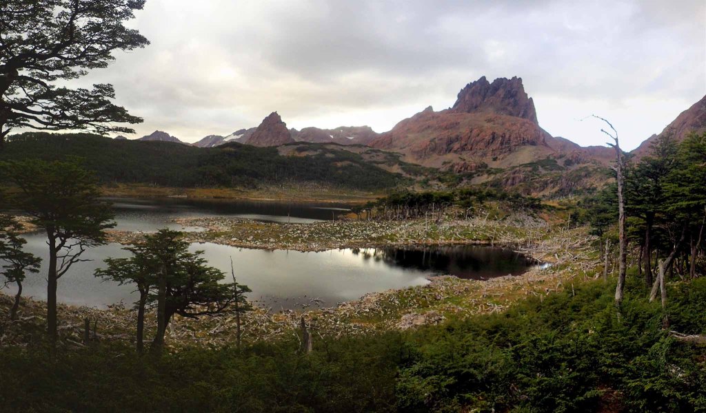 In the morning we said farewell to the Chileans and headed off on the short walk to the shore of Lago Windhond. We sat there for a while watching ducks drift about, tried to make out how many islands were in the lake; that sort of thing. Growing restless we retraced our steps, packed, ate and headed back the way we’d come from. Mum led us across the peat and we managed to find a bunch more of those red berries (looking like raspberries and tasting a bit similar) Nam had found initially by the river crossing the day before. The way up seemed a lot easier. Maybe it was a little drier? Whatever the reason, we made good time. We passed a group heading to the refuge above treeline, and had lunch (by dad’s order) in the open. We caught our Chilean friends lunching by the lake (they had extremely muddy shoes). We didn’t talk long before continuing up to the summit. The views were great again, though perhaps a little less clear. The Cabo de Hornos (Cape Horn Islands) were still just visible to the south. Discovered by Dutch shipowners Shouten and Le Maire, when searching for a new route to the Pacific Ocean. Until the opening of the Panamá Canal on the 20th century it was one of the most difficult challenges sailors had to face going around the world… (what about the Magellan passage? Why didn’t they use that?).The wind and promise of camp coaxed us on. Dad zipped ahead and I soon followed. We waited at the treeline, the wind much lessened. The signs of beavers seemed much more prolific on the way back, maybe we’d just learnt what to look for. Arriving back at our previous camp spot we found our caches uncompromised. We never did see the caches the other groups had hidden. Interestingly, the couple had told me they’d mistaken our hanging food bag as one they’d heard the cabarreros place around the mountains to use in emergencies.We set up our tents on the somewhat damp ground and cooked dinner behind the rock However, the wind made it rather unpleasant and we all quickly retired to our tents. In fact I believe mum never even left to eat dinner.