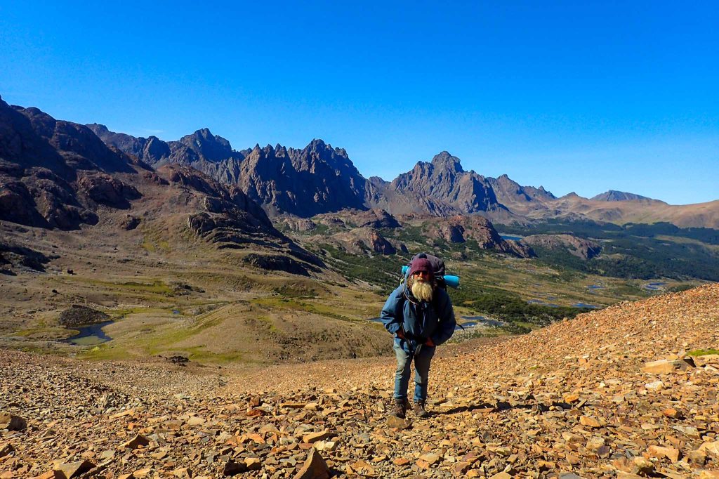 It was a chilly morning and mum headed off long before the rest of us. Ice fell off my tent as I dismantled it, taking time to warm my fingers as I packed my bag. We headed back up to the cruz, up over a ridge and down to Laguna de los Dientes, the impressive Cerró Gabriel towering to one side. As we skirted ‘round, we passed some nice camps, one occupied by a British guy we would pass twice more as the day progressed. The views were fabulous, and remained so as we walked up the small valley to the hidden Laguna Escondida. It was very windy, but we were hungry, so we ate on a small lookout platform, while draping our rain flys and ground sheets over the railings to dry, flapping in the wind.