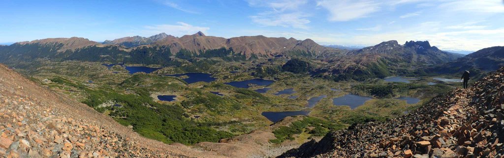 From here we climbed up to a rocky knoll above Laguna Islote were we enjoyed «marvellous views back south to the rugged Montes Lindenmayer and Laguna Alta, a high hanging lake with an outlet cascading into the valle Guérrico.»