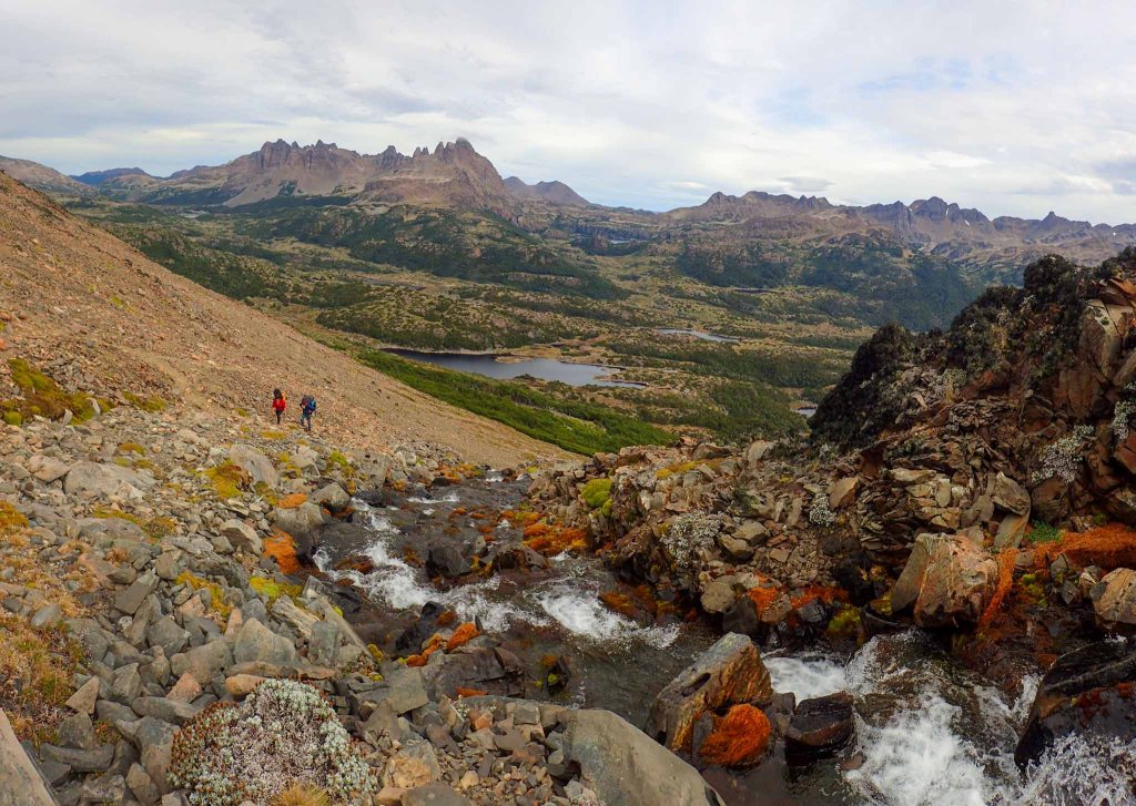 Spurred on, we passed more tarns as we headed up to the pass. The British guy materialised behind us apparently having taken a wrong turn and we passed him again at the final tarn before topping out on the windy Pasó Ventarron (696m). The uncountable Chevallay lakes and ponds stretched out before us bounded by the Montes Condrington on the far side (named after captain Fitz Roy after one of the crew on the HMS Beagle). Weariness was catching up to us but despite the vista, it was no place to rest so we pushed on accompanied by stellar views as we contoured high along the side of the valley. The British guy passed us again, but we met up shortly after as I found his pack cover and caught up with him to give it back. Just before Paso Guerrico, we found a relatively sheltered spot to spend the night. It was still early, but we’d made good time on the previous days so were in no rush. We figured camping early at a less established location would provide some privacy, as well as better wind protection than the more popular sites around Laguna Hermosa. After playing around with some dams, inspecting interesting holes and relocating the tent to a drier site nearby, we were surprised when lots of people suddenly arrived. Most were a commercial group, but they all seemed to have similar ideas and set up camp around us. This remote, uncrowded walk’s reputation appears to be turning it into the opposite!