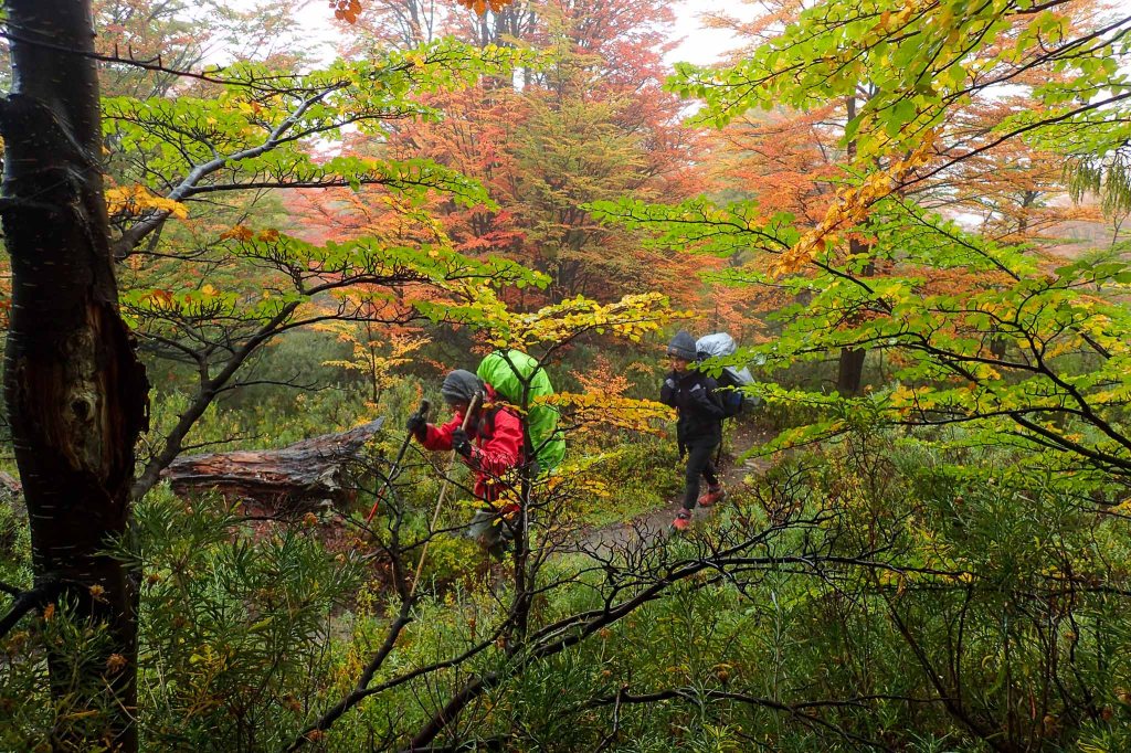 A little further on we breakfasted within the shelter of some trees, a fine drizzle increasing as we climbed higher encouraging us to put on pack covers, and mum, the last to don a rain jacket. Just after entering the park boundary, we passed a baño and then a small drinking source. Out of the trees now, the track climbed more steeply upwards, past another estero and finally plateaued out. I’d been thinking about where to camp… my personal choice was down by the laguna, but Nam hadn’t been here before, so I thought the hidden tent site I had spotted on my way up Cerró Rojo (on our previous trip) would be a good option. I dropped my pack and scouted around quickly locating the site which included an emergency cache – we’d fit.
