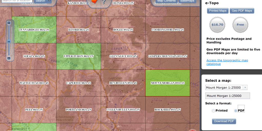 Browsing the internet I also found that the SIX Maps server now allows the public to download GeoPDFs for free. If you visit maps.six.nsw.gov.au/etopo.html you can see the state overlayed with small green and red rectangles. Green just means that the printed map is available for sale.