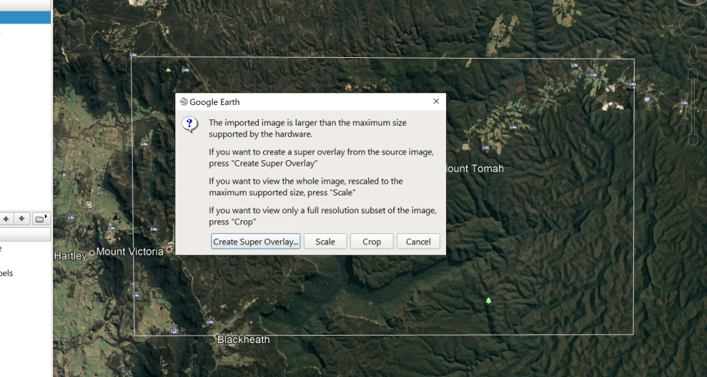 You might get a message that your computer hardware won’t support an image so large. Don’t worry! You can create a Super Overlay which basically chops the map up into small parts so that your computer only has to draw a small part at a time (I found that the «Scale» option provides a poor resolution in most cases).