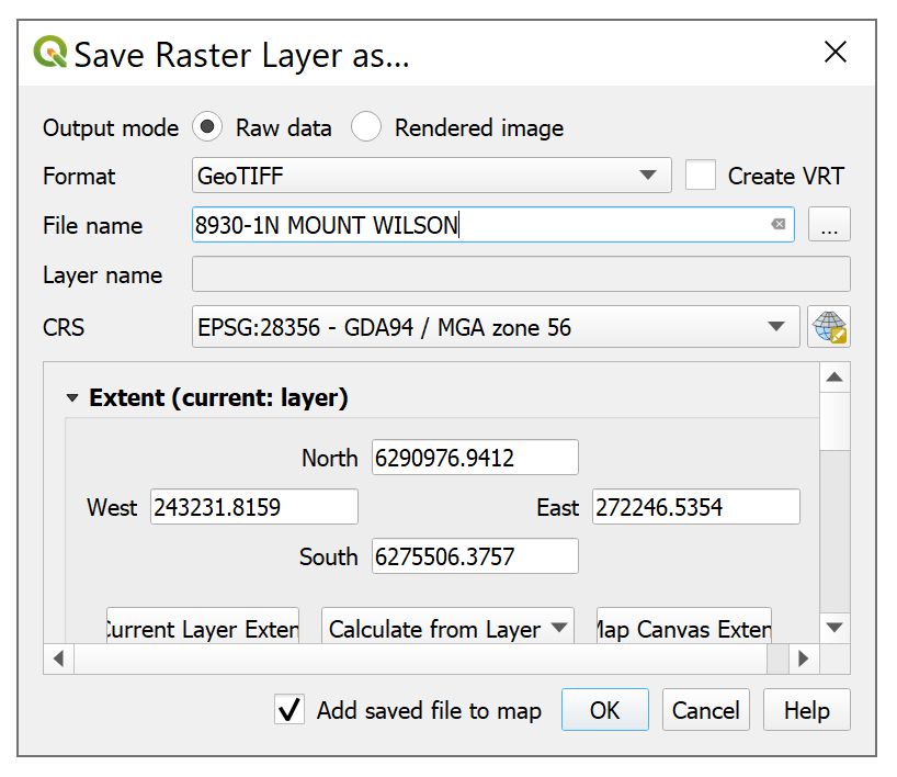You can then select GeoTiff from the dropdown menu and enter the name you want to use for the resulting file. I think using the same name as the PDF is a good idea.