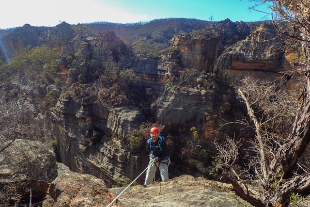 Everyone satisfied they had the basics down, we continued to the cliff edge, but some scouting didn’t turn up an anchor… maybe the track just led to a lookout? Skirting around a gully, we found an anchor beside a second much larger pagoda… in hindsight it was probably not the abseil point I’d been told about, as this one turned out to drop around 50m! as opposed to the 30m I’d been told (I think this one is in the gully we passed).