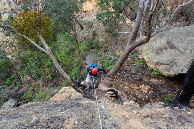 Joel formed the vanguard, abseiling down to the first ledge using a self-belay. As expected, the rope was short so the munter-mule was released until we heard Joel shout up from below.