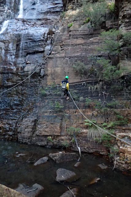 «Wolgan Falls is a new abseil trip created by Laurie Cohen and Mick Barr… Abseil 1 is only a short walk from where we park. The pagoda landscape is spectacular with the Wolgan River twisting through the sandstone gorge then plunging over the falls. There are four abseils with drops around 40m. The final abseil is next to Wolgan Falls. It is a dry trip with no swims or wades.»