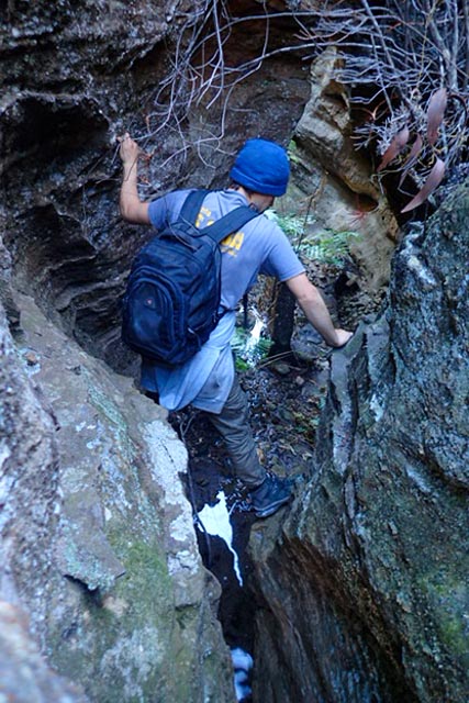 Quickly we approached a point where the creek dropped through a tight constriction. At first it seemed to be an abseil, but Lukas skirted around the ironstone ledges to the right to where we could climb down. We’d found the canyon! (it matched with the photo I had).