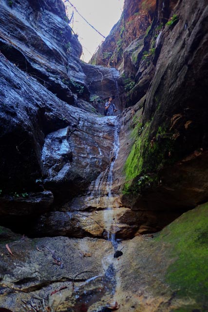We figured it was about 30m, so our rope should just reach. There were various anchor options including a large tree out a long the ledge on the right. This would keep us dry, but we decided to abseil right down the centre. Lukas threw down the rope and down I went. It turned out the drop was about 30m, but with our anchor set back from the lip, in effect it was more like 35m. We were short!