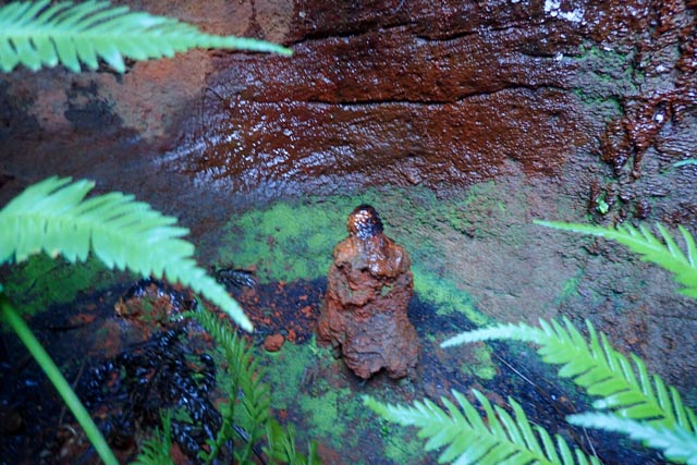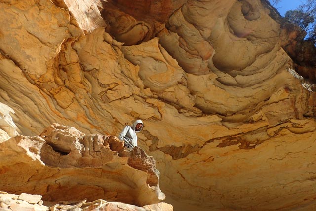 Approaching another spot where the ck cut down steeply through the sandstone, we traversed around the waterfall using the available ledges. Walking through the tunnel created by a large boulder, and some careful balancing over unsturdy sticks to stay dry we reversed up to the bottom of the would-be abseil. There were some interesting ironstone formations and Lukas commented that one day he could make a car out of the iron. We dubbed the stalagmite «Lukas’s car embryo».