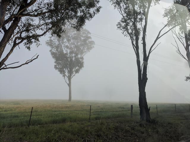 Our alarm stirred us slowly into action. Breakfast, more packing, then we finally crammed everything into the back of Michael’s ute. It only just fit. A white frost coated the ground and the hose on the water tank had frozen solid.