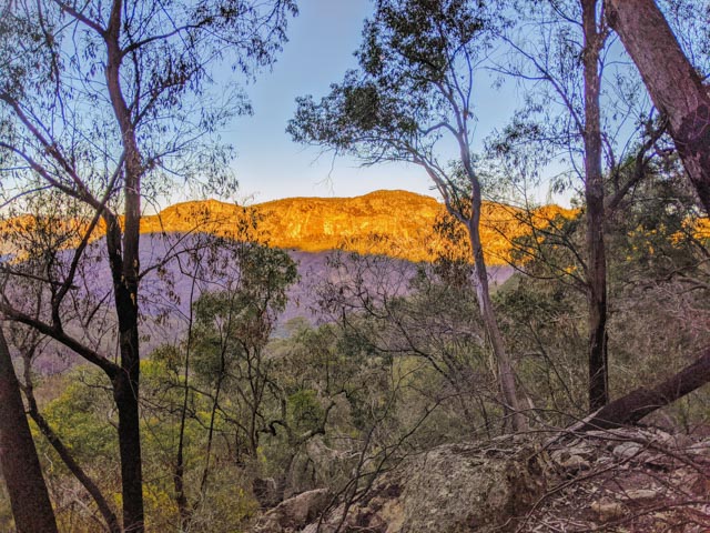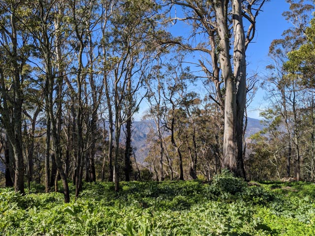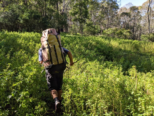 Avoiding the electrified paddock with bulls we passed Owen’s derelict bulldozer. Then climbed over at a fence-stay and convenient tree, passing packs over to make it easier for everyone. Dropping out of sight we entered the national park… and dense stinging nettle enjoying the rich basalt cap soil. Owen and I had shorts on, but they managed to penetrate the others pants on occasion, and was so high you needed to be careful with your hands. A firetrail lent some reprieve (I wasn’t about to go back to get the camera I’d left in the car!)