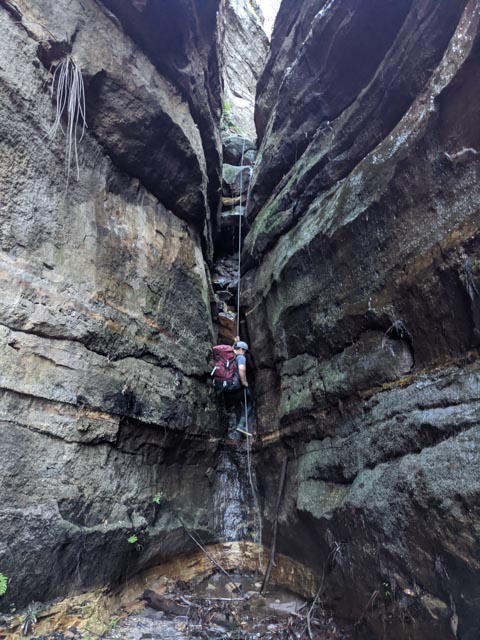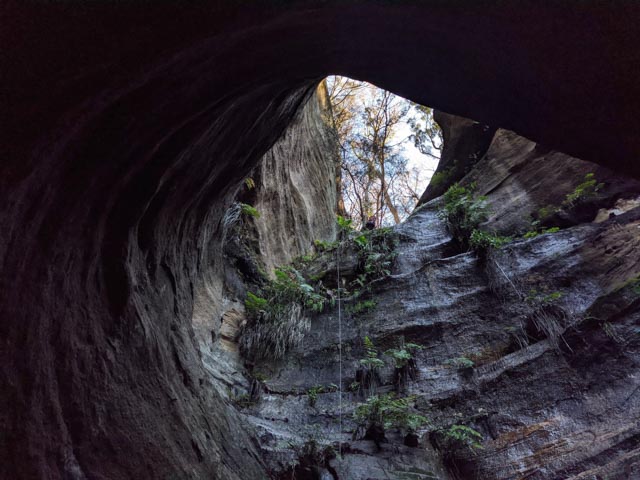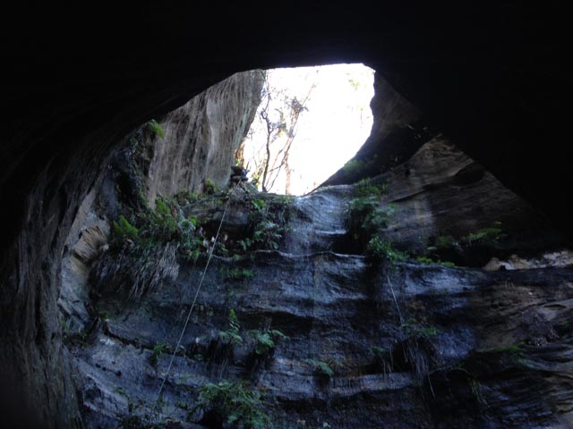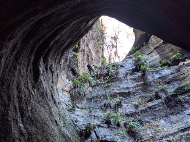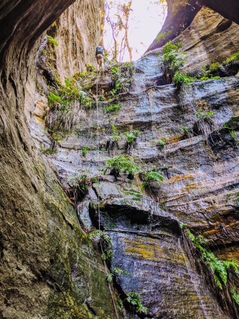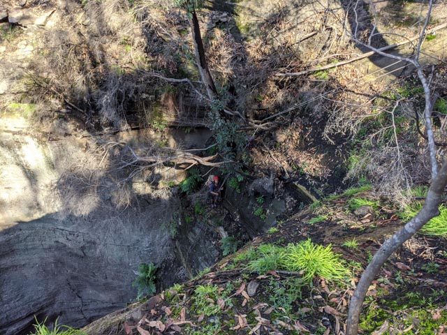 Walking to the brink, the drop was further than I had guessed by looking at maps… at least 30m… There was a rebelay tree we’d probably want to use… If we could get to it! Using one end of the rope, I abseiled down on an angle to it. (It was more accessible than expected.).