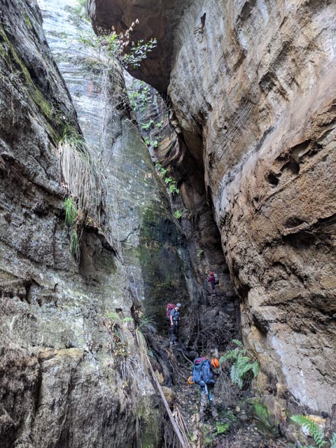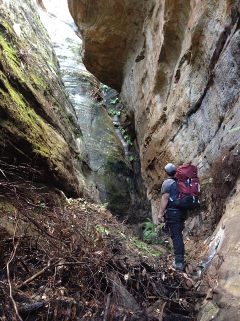 We passed a short but long overhand before the confluence, but much of it was damp with perhaps a choice spot for only one. Crossing over the main creek I scouted ahead and found a great looking spot below the cliff line with decent views into the valley, featuring majestic golden cliffs on the opposite side. I headed back to report (and get my pack).