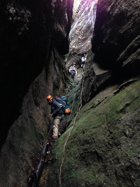 What to do? I wanted to ghost the canyon, but it seemed safer to rig with some tape and a rap ring. We went with this in the end and I carefully dropped down, hoping the rope was both long enough and didn’t end in a deep pool. Lucky on both counts. The rope was a little short, but you could swing to the left a little and abseil off the end.
