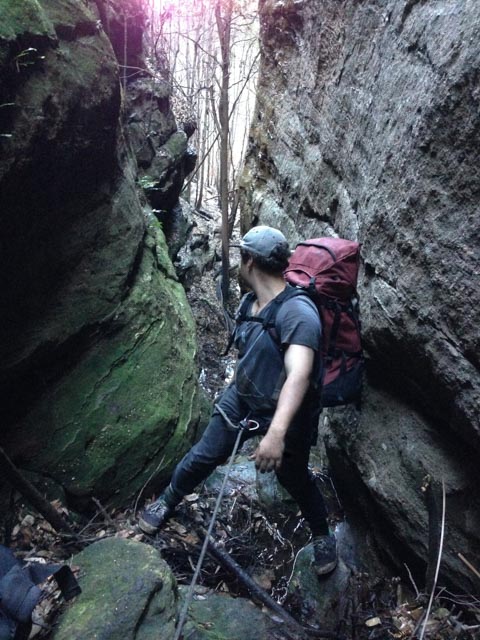 Once Michael joined us we did some gardening to clear a large area. We’d brought the shovel for another reason entirely, but it came in handy now as we set about constructing a cairn anchor. We farmed what rocks we could find, Michael turning up the key rock around which we’d tie our tape. It’s geometry wasn’t perfect, but with a small concavity it’d do the trick. We hadn’t brought the shovel for the canyon, but it came in handy now and we soon piled rocks, dirt, sand and small logs on top.