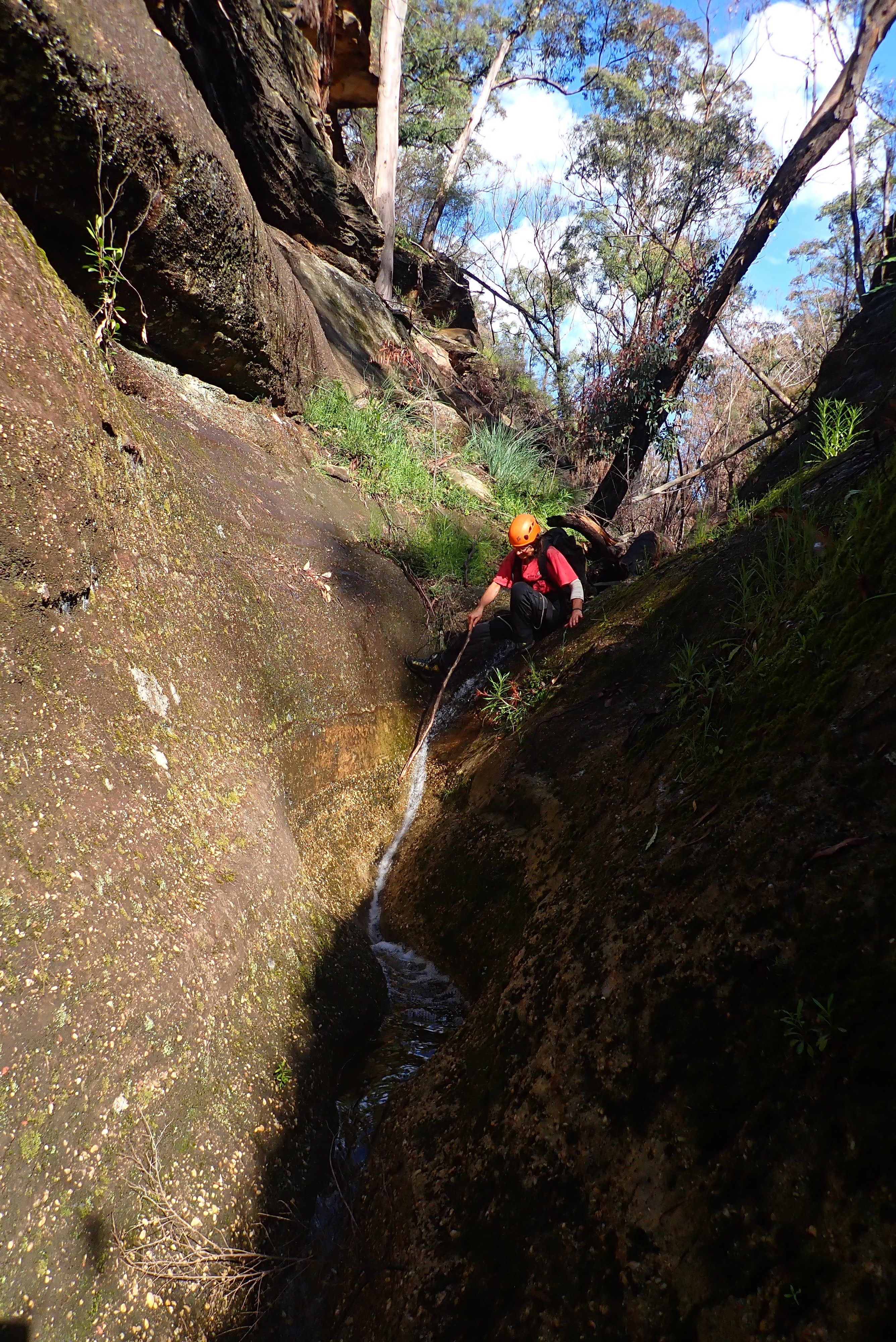Reaching the saddle, we dropped down into the creek which already had a bit of water. It was easy going, the creek swelling as small rivulets and other creeks bolstered its flow. The water soon began to cut down into the sandstone creating a ‘V’ shape. We harnessed up when we reached the first drop though the canyon didn’t really close in just yet. There were still escape options until the creek again dropped. We abseiled; though from the bottom it looked climbable.