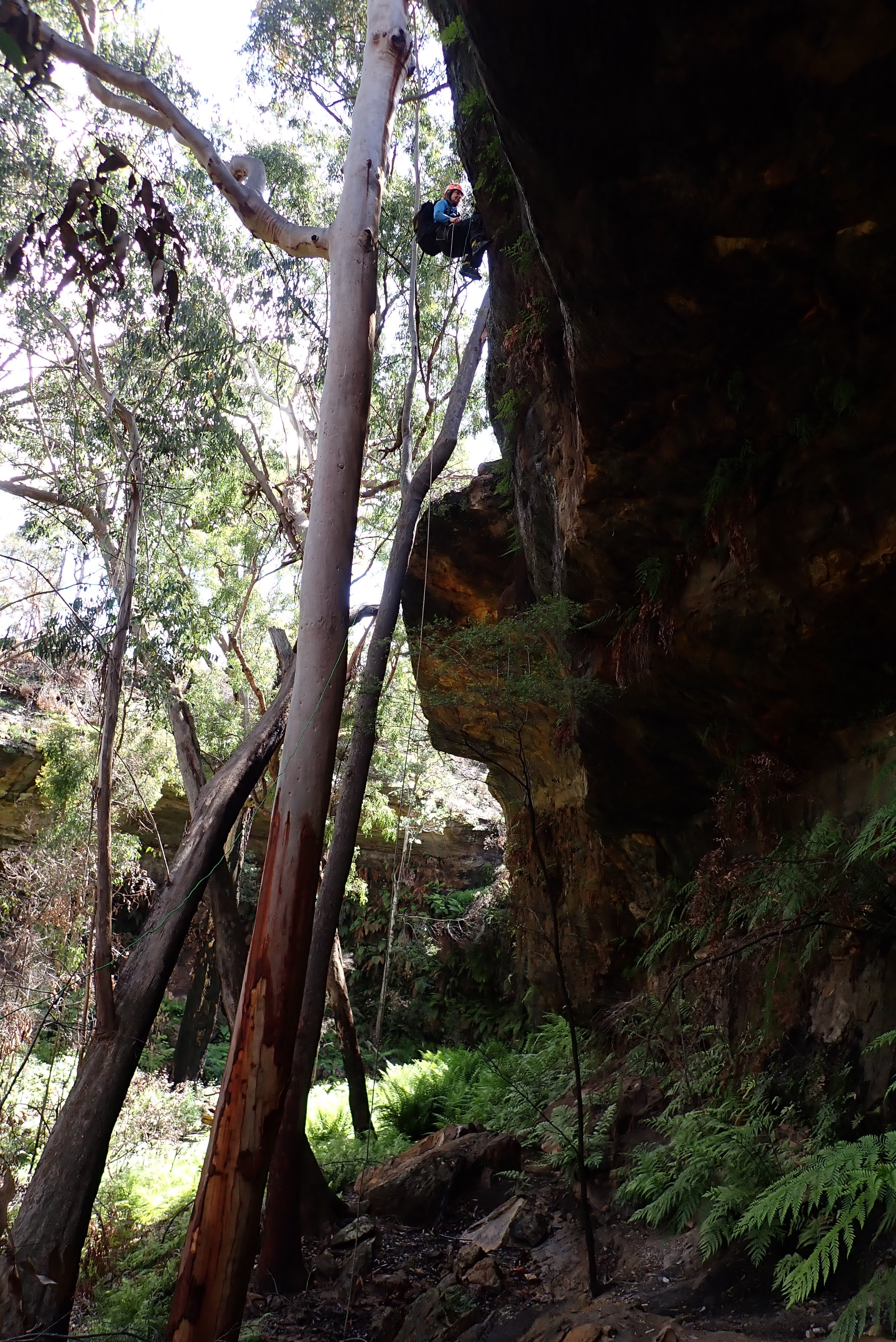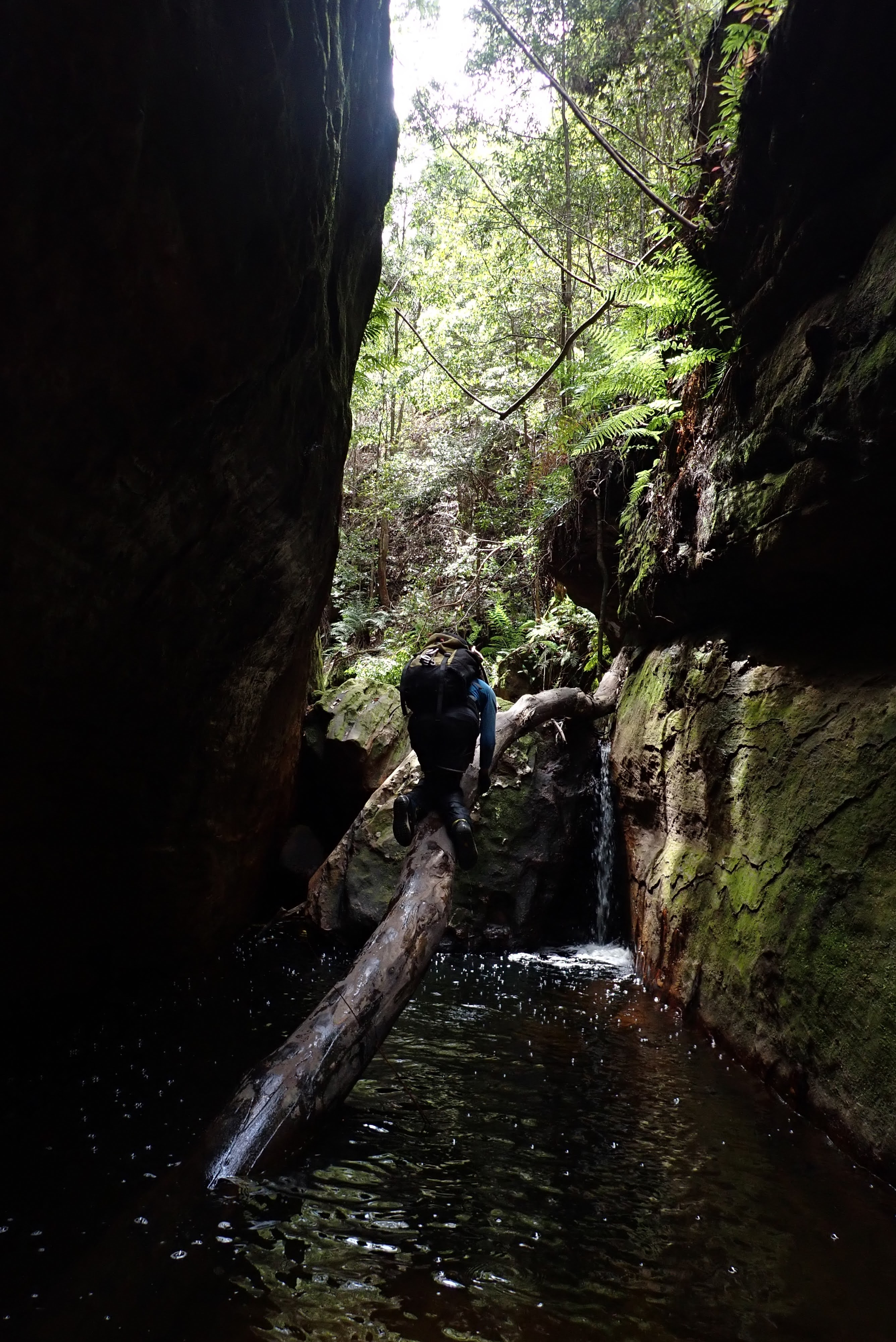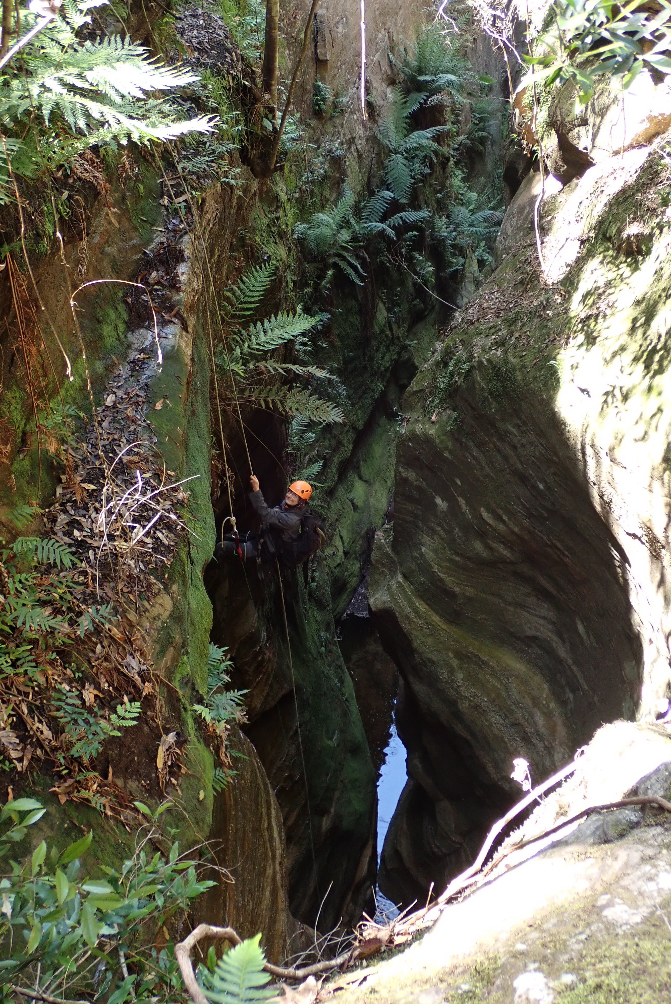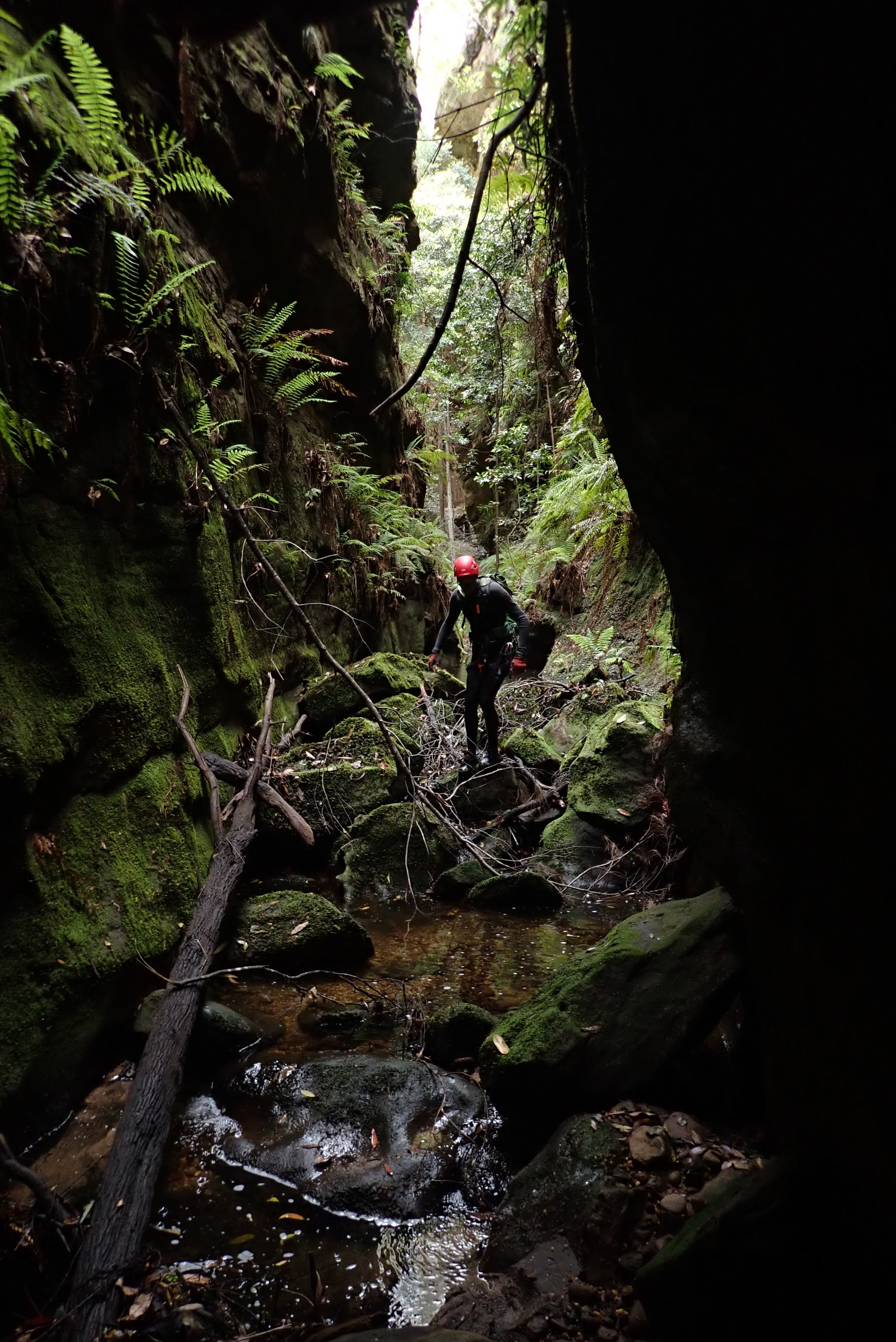 The canyon opened up and was quite vegetated but the walls were still sheer on either side though an interesting side canyon broke the cliff on the right entering via a small waterfall, it looked worthy of some future exploration. We poked around a bit in a couple of overhangs and surveyed our options for abseiling: there were lots. In the end we stuck to the chute the water had carved. You could nearly downclimb but it was a little too dicey and we both abseiled the short drop off a jammed log. The canyon quickly became dark and deep, some coachwoods stretching straight and high to reach the strip of light far above.
