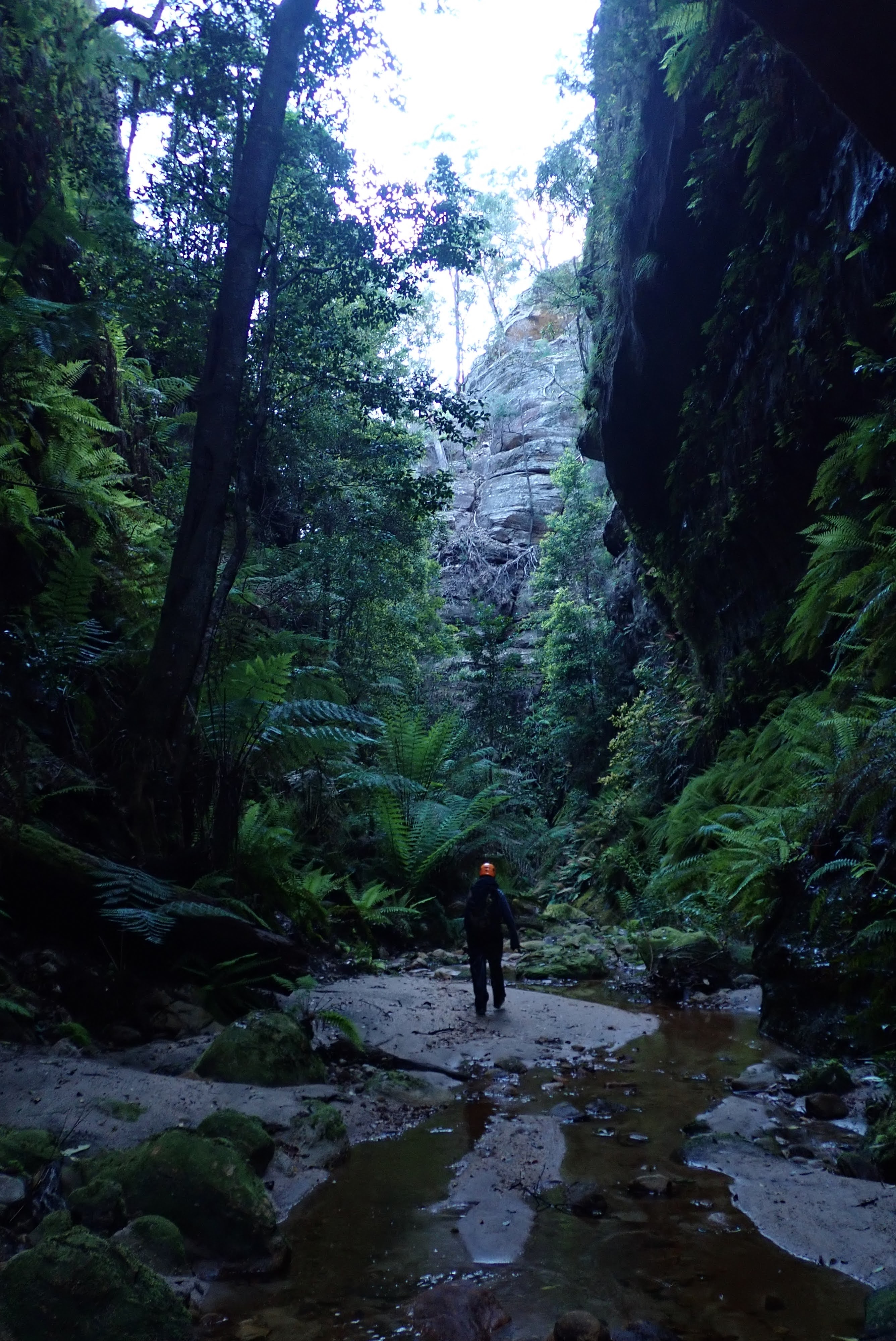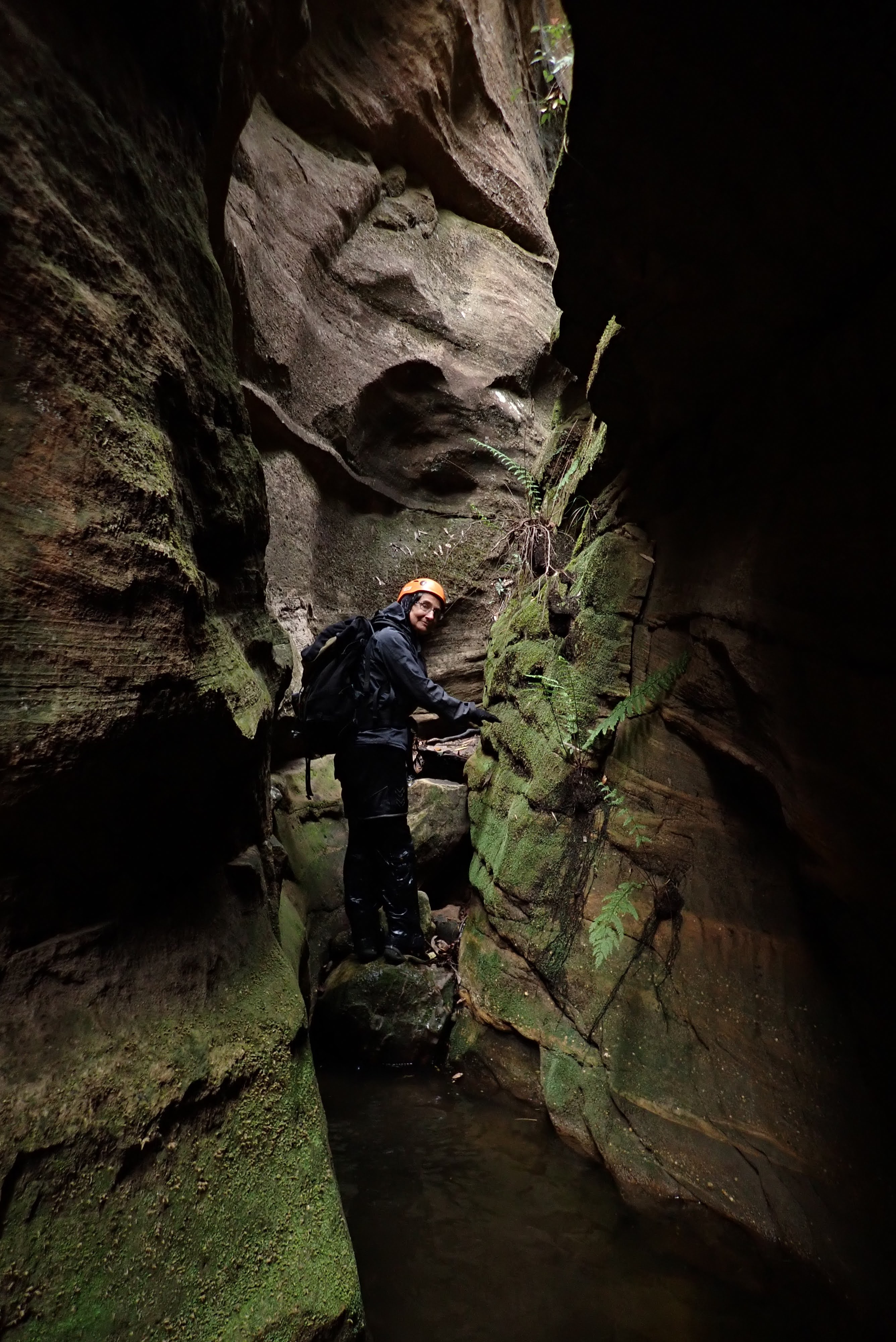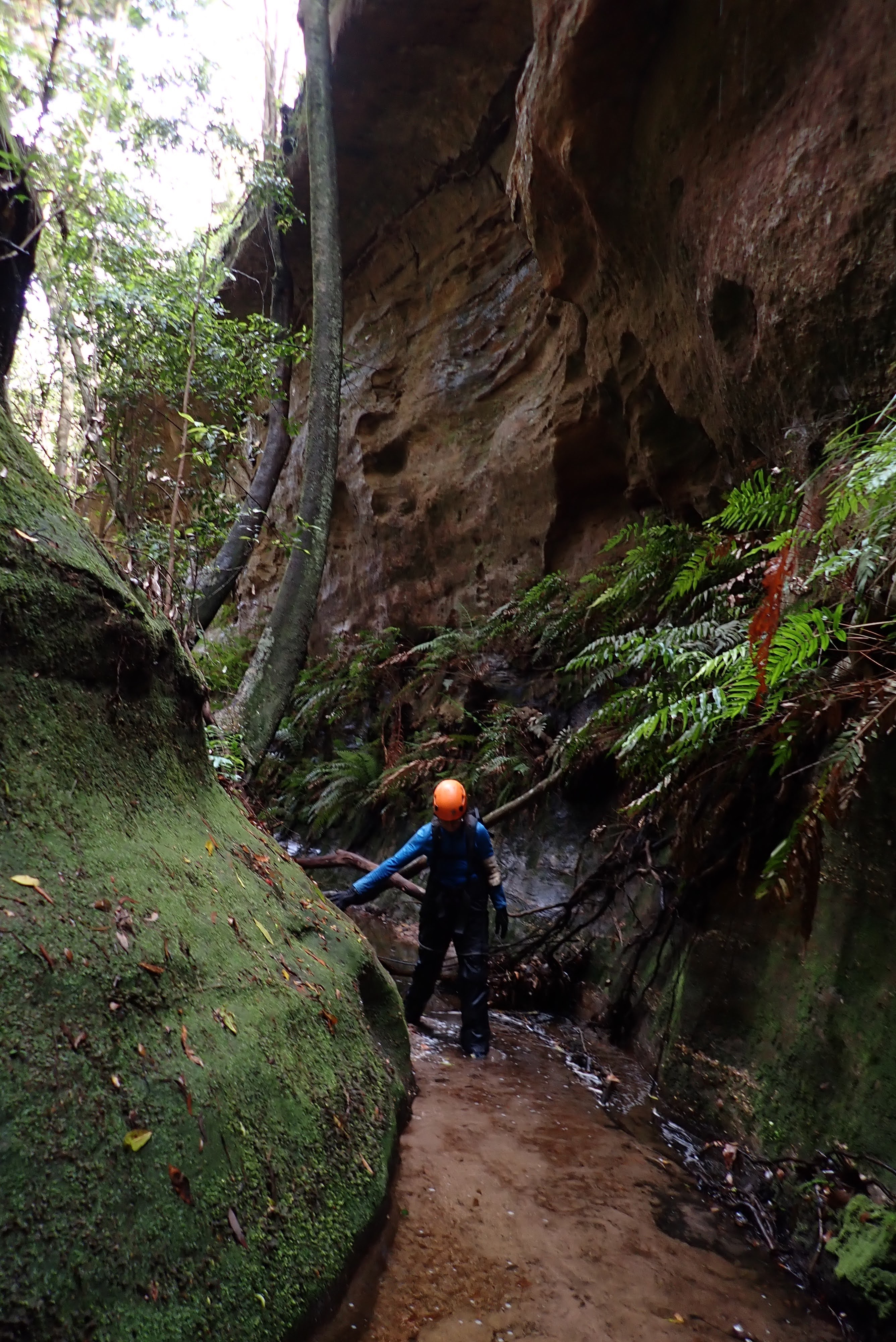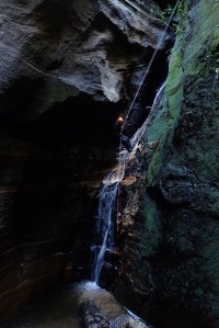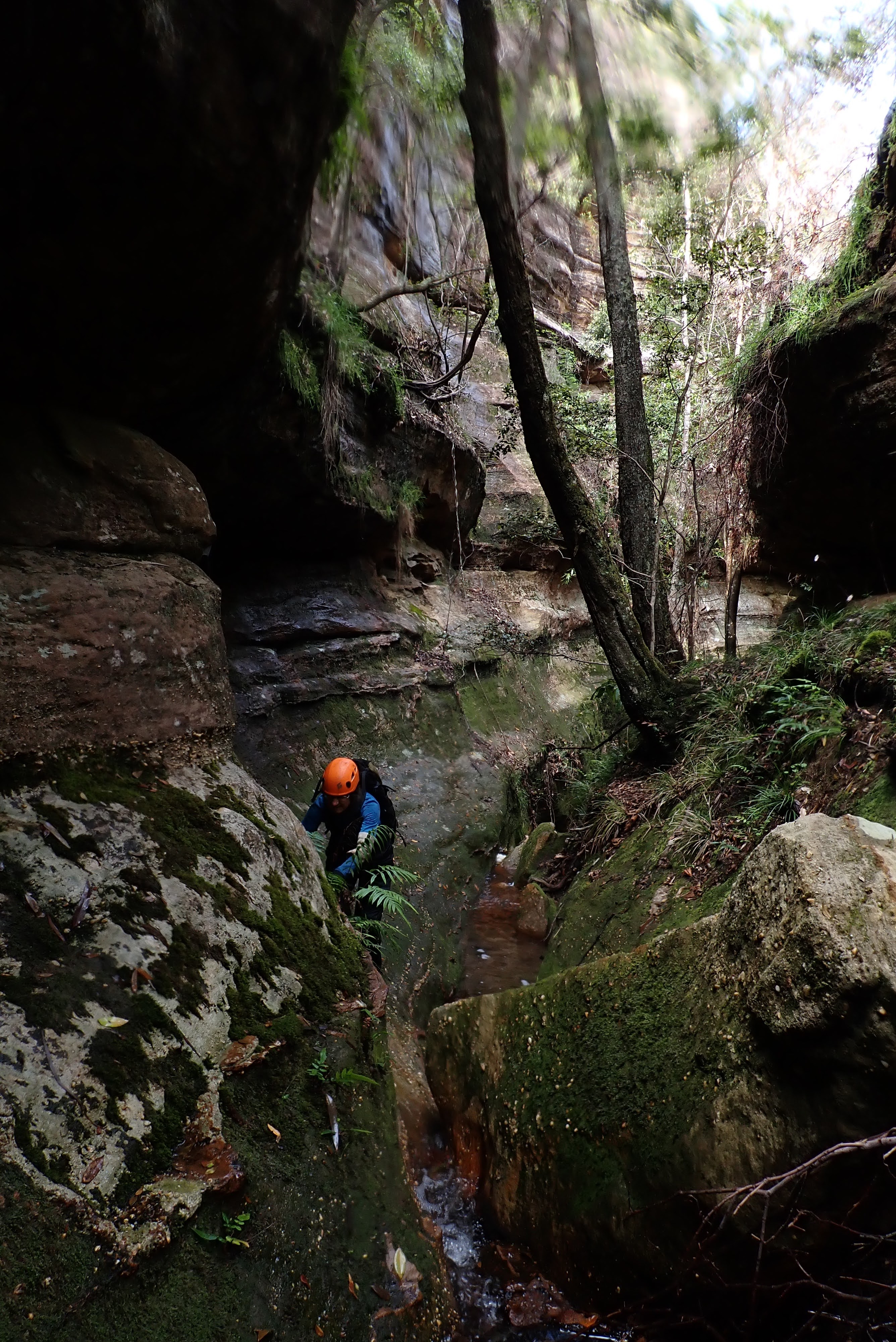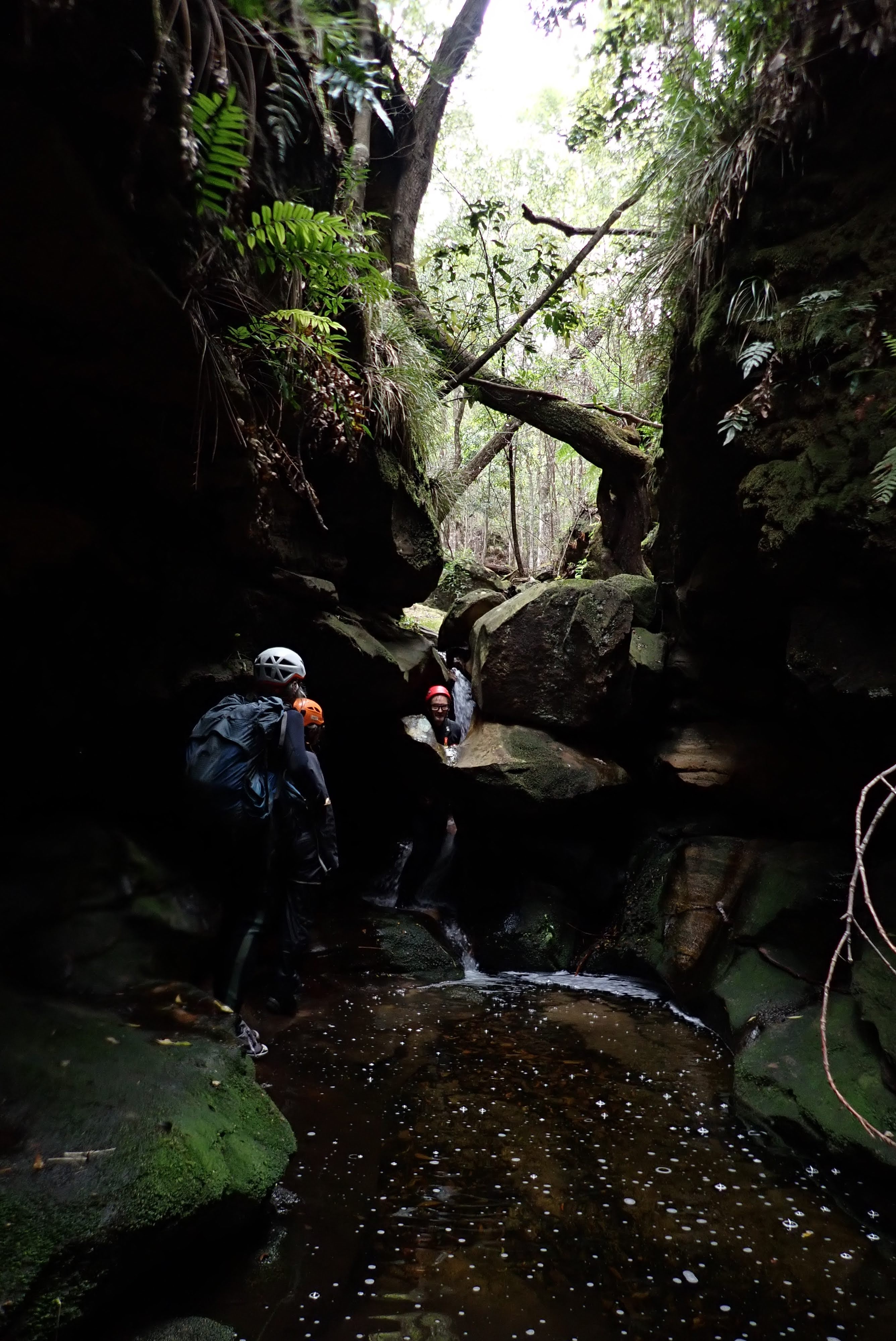 The canyon opened up and was quite vegetated but the walls were still sheer on either side though an interesting side canyon broke the cliff on the right entering via a small waterfall, it looked worthy of some future exploration. We poked around a bit in a couple of overhangs and surveyed our options for abseiling: there were lots. In the end we stuck to the chute the water had carved. You could nearly downclimb but it was a little too dicey and we both abseiled the short drop off a jammed log. The canyon quickly became dark and deep, some coachwoods stretching straight and high to reach the strip of light far above.