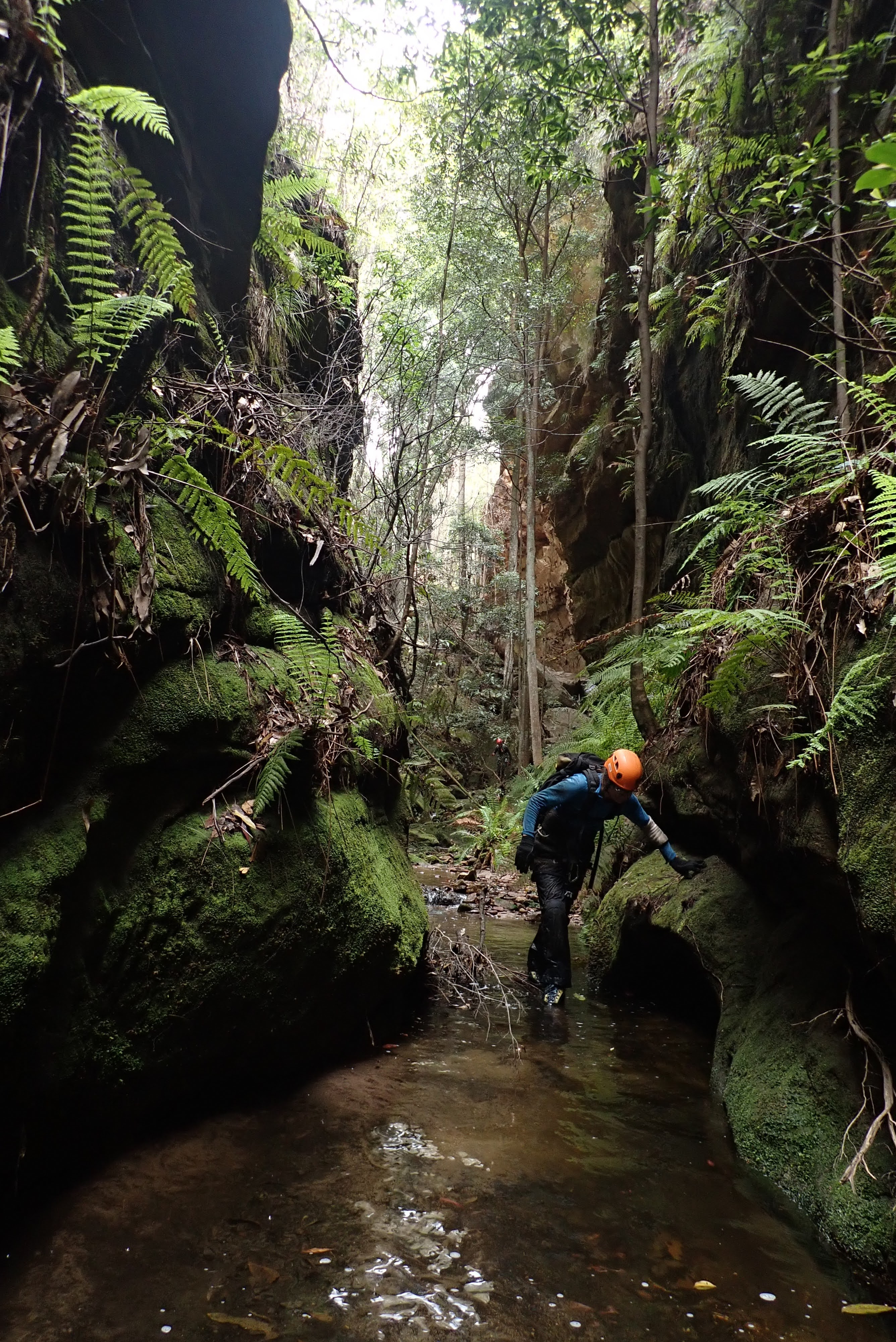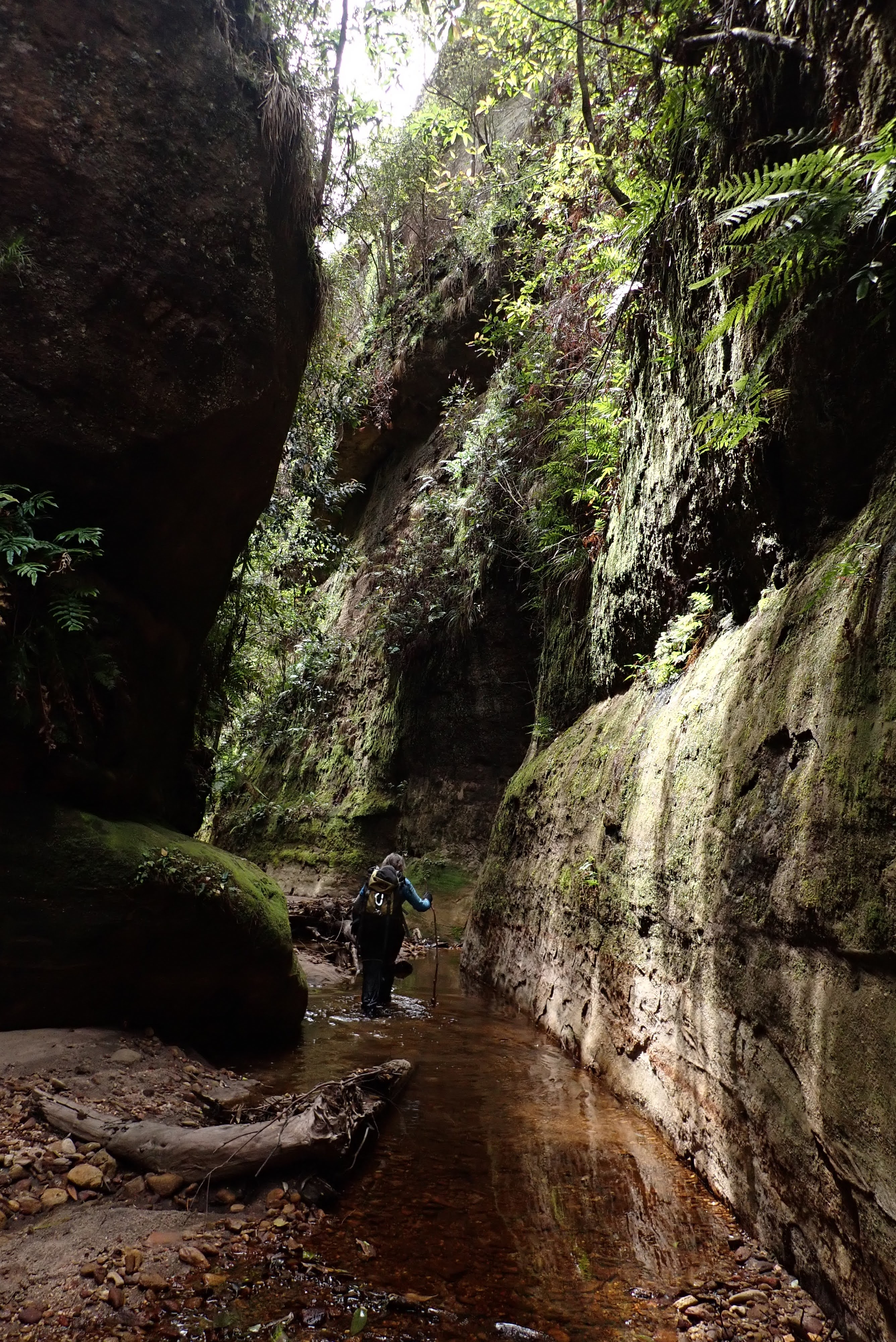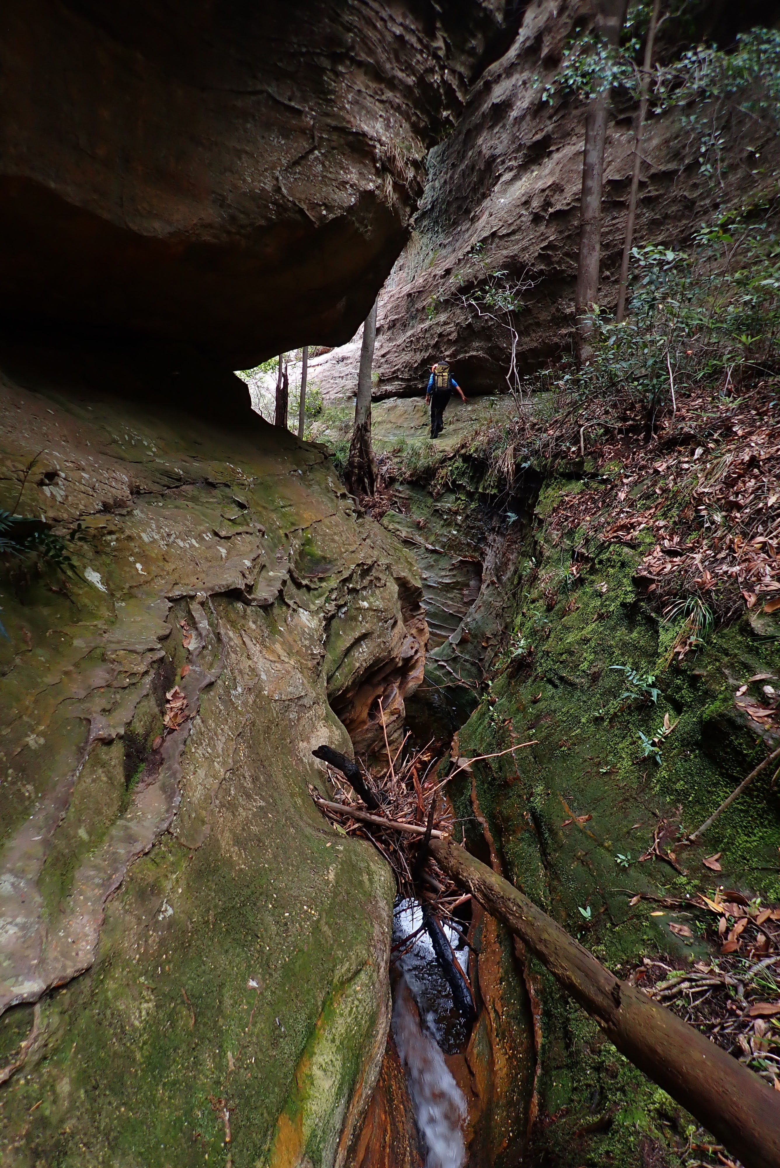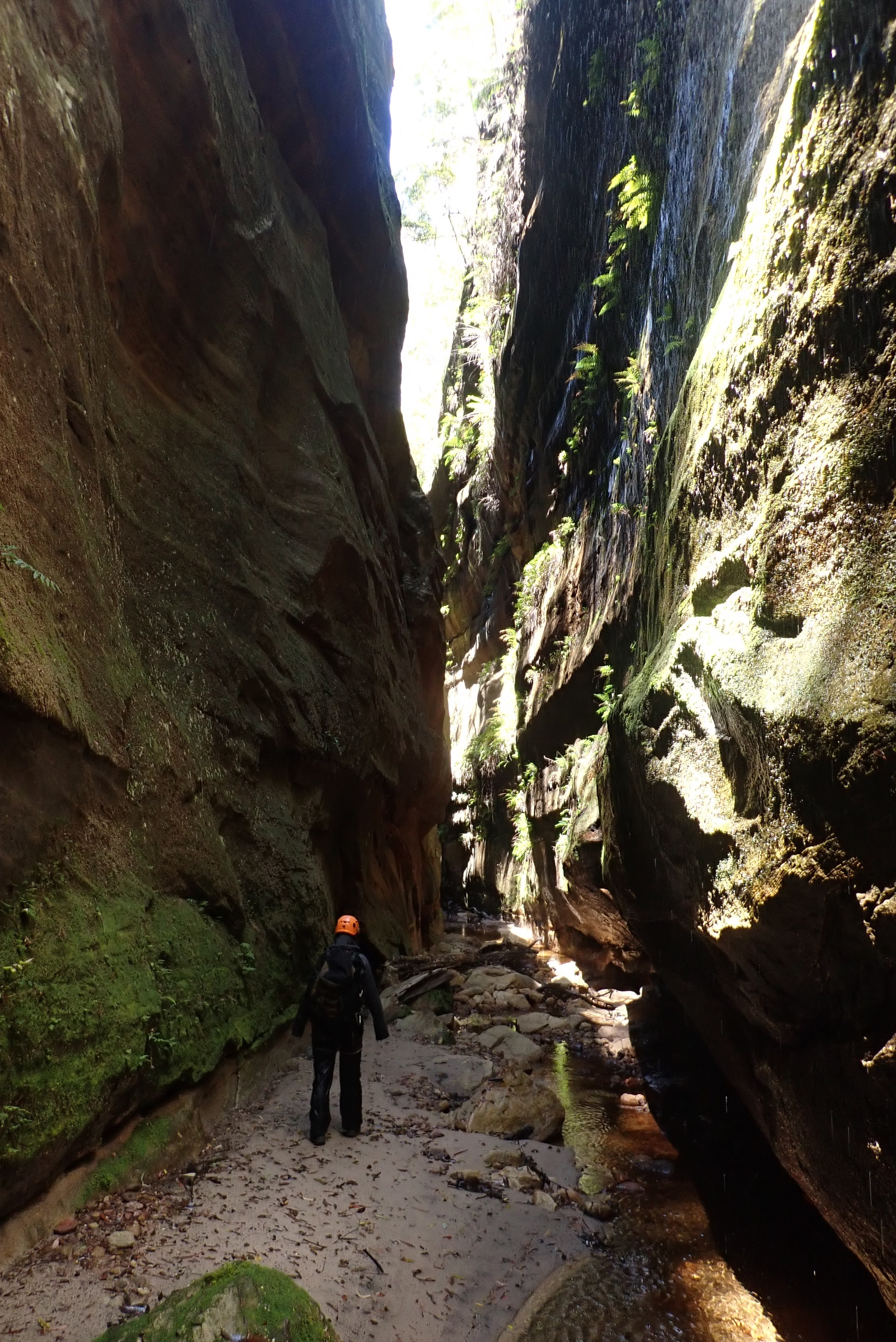 The canyon opened up and was quite vegetated but the walls were still sheer on either side though an interesting side canyon broke the cliff on the right entering via a small waterfall, it looked worthy of some future exploration. We poked around a bit in a couple of overhangs and surveyed our options for abseiling: there were lots. In the end we stuck to the chute the water had carved. You could nearly downclimb but it was a little too dicey and we both abseiled the short drop off a jammed log. The canyon quickly became dark and deep, some coachwoods stretching straight and high to reach the strip of light far above.