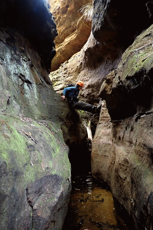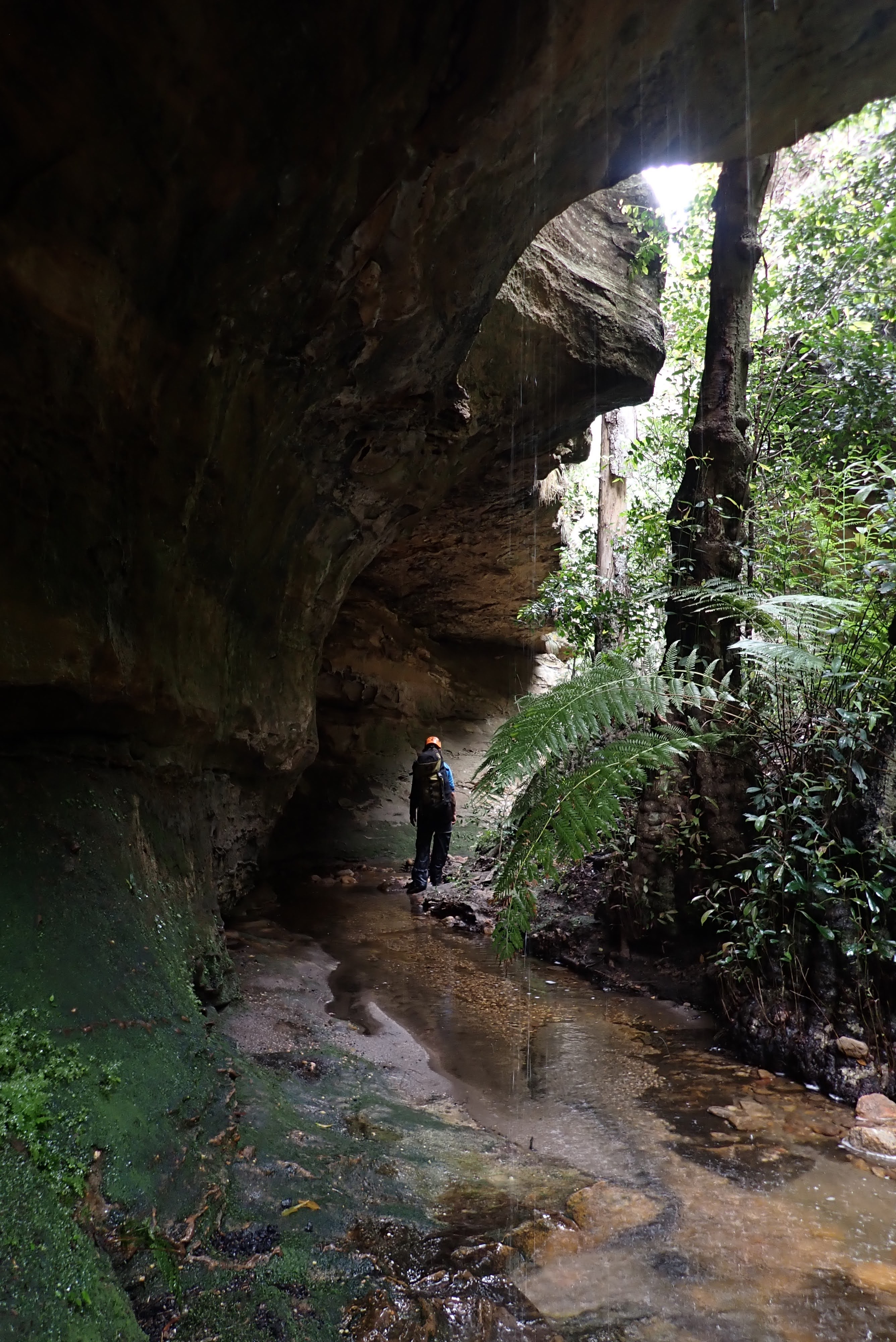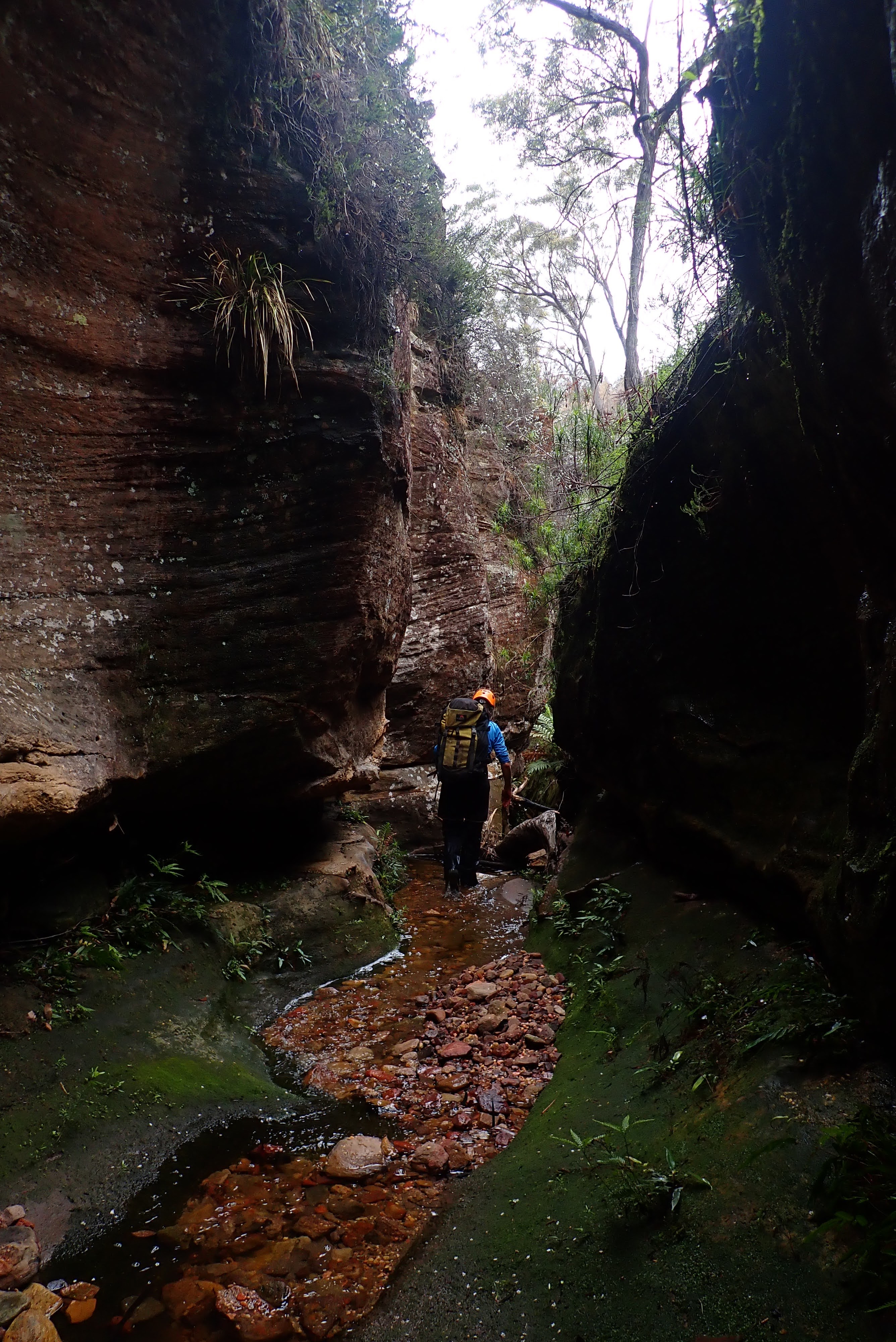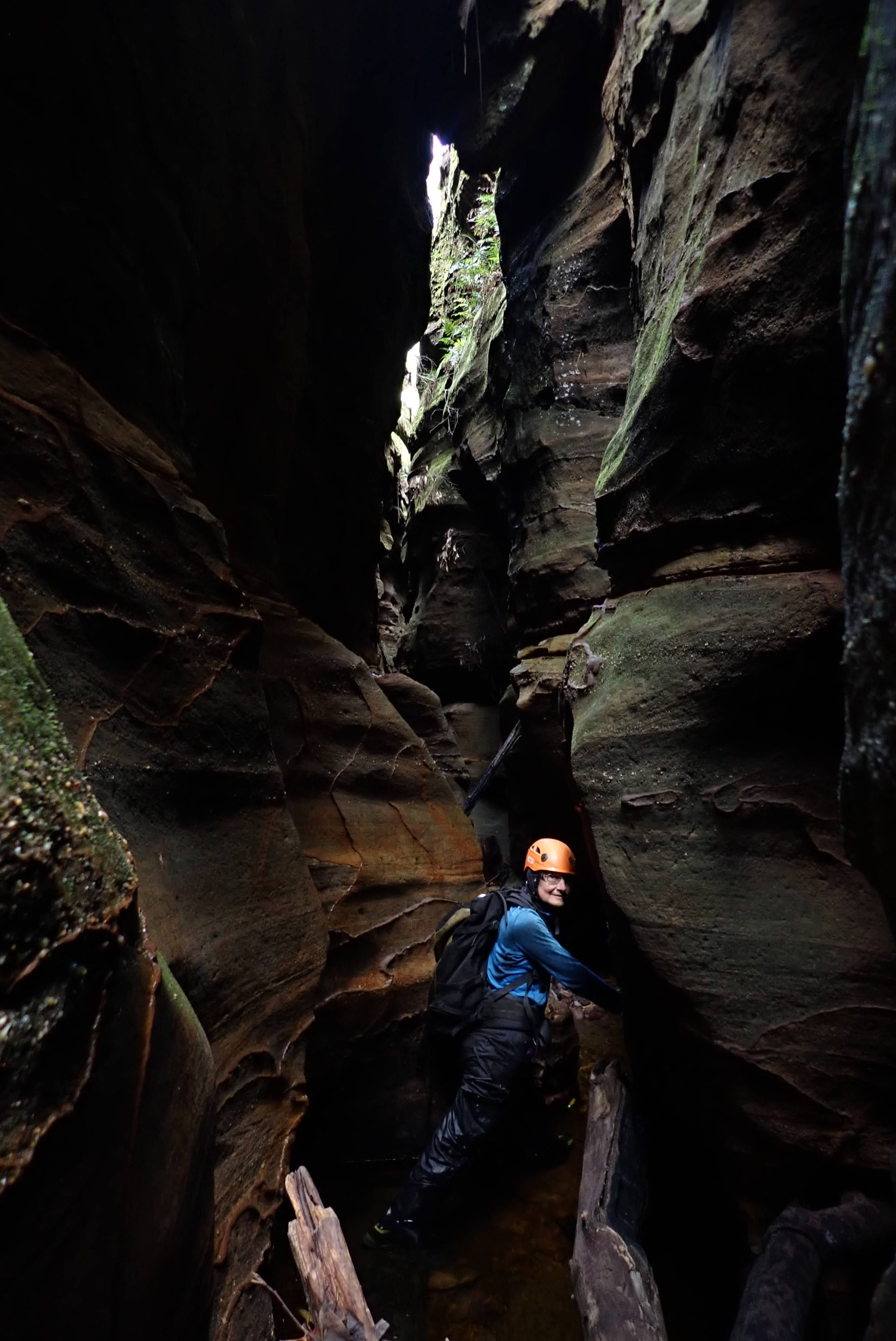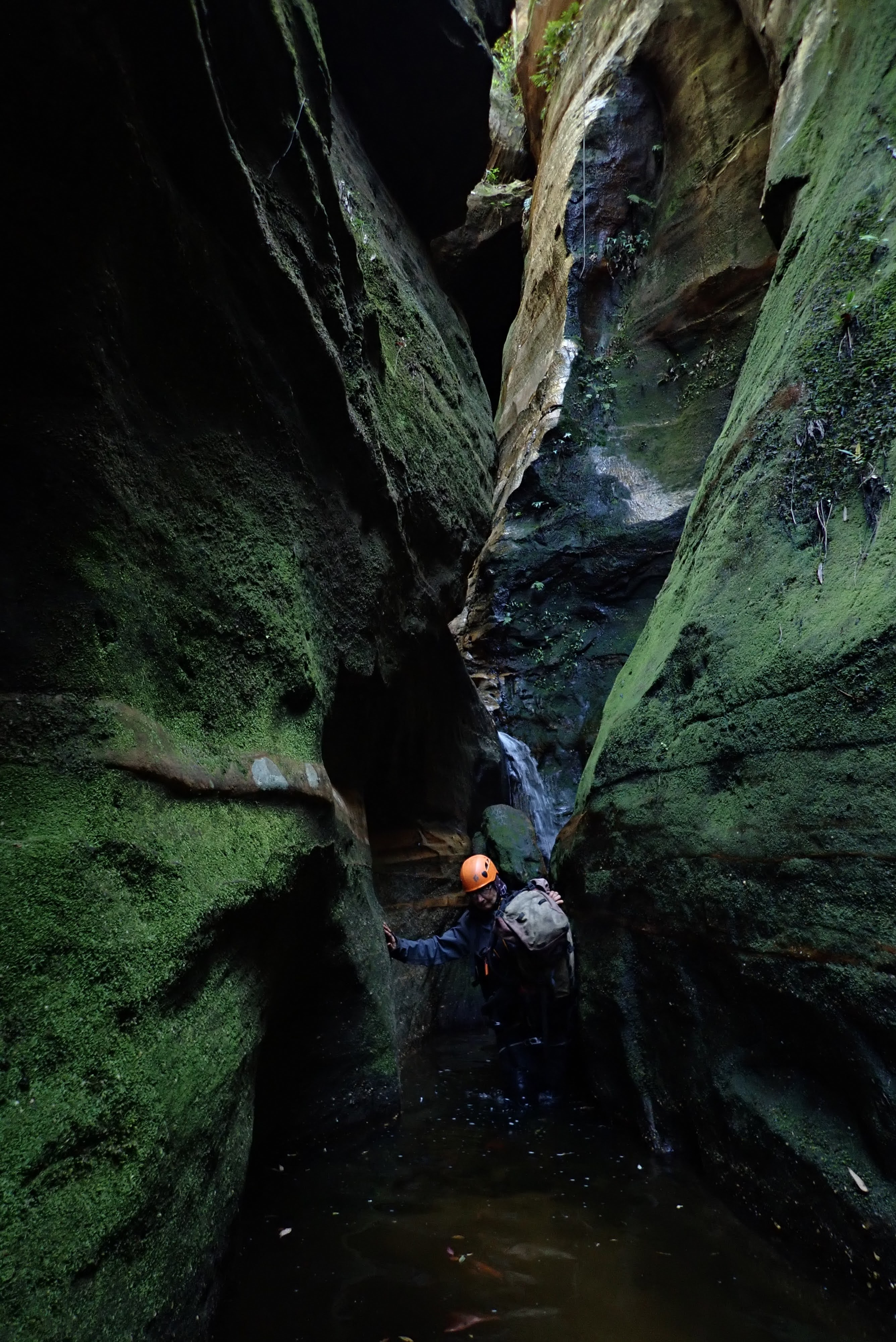 The canyon opened up and was quite vegetated but the walls were still sheer on either side though an interesting side canyon broke the cliff on the right entering via a small waterfall, it looked worthy of some future exploration. We poked around a bit in a couple of overhangs and surveyed our options for abseiling: there were lots. In the end we stuck to the chute the water had carved. You could nearly downclimb but it was a little too dicey and we both abseiled the short drop off a jammed log. The canyon quickly became dark and deep, some coachwoods stretching straight and high to reach the strip of light far above.