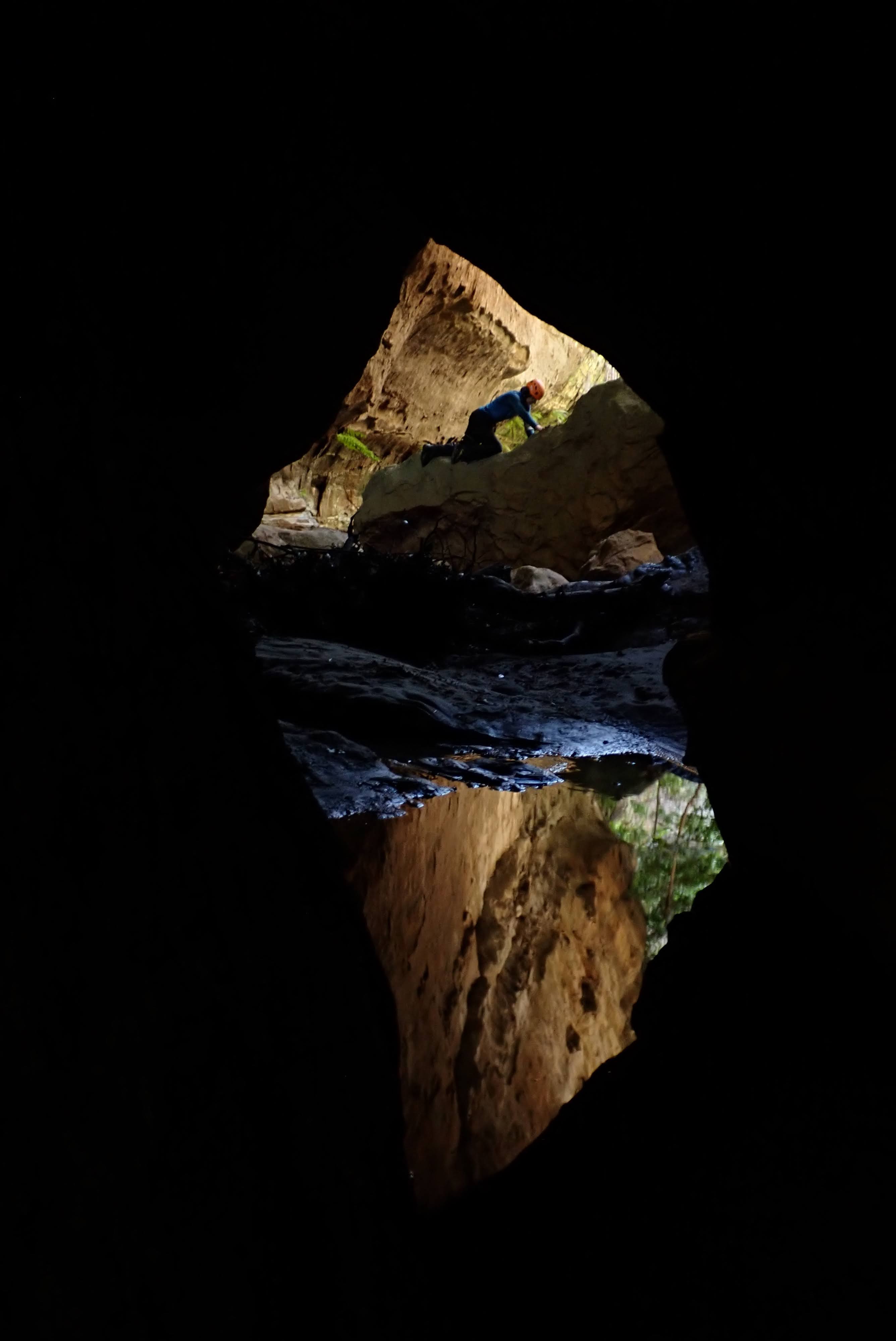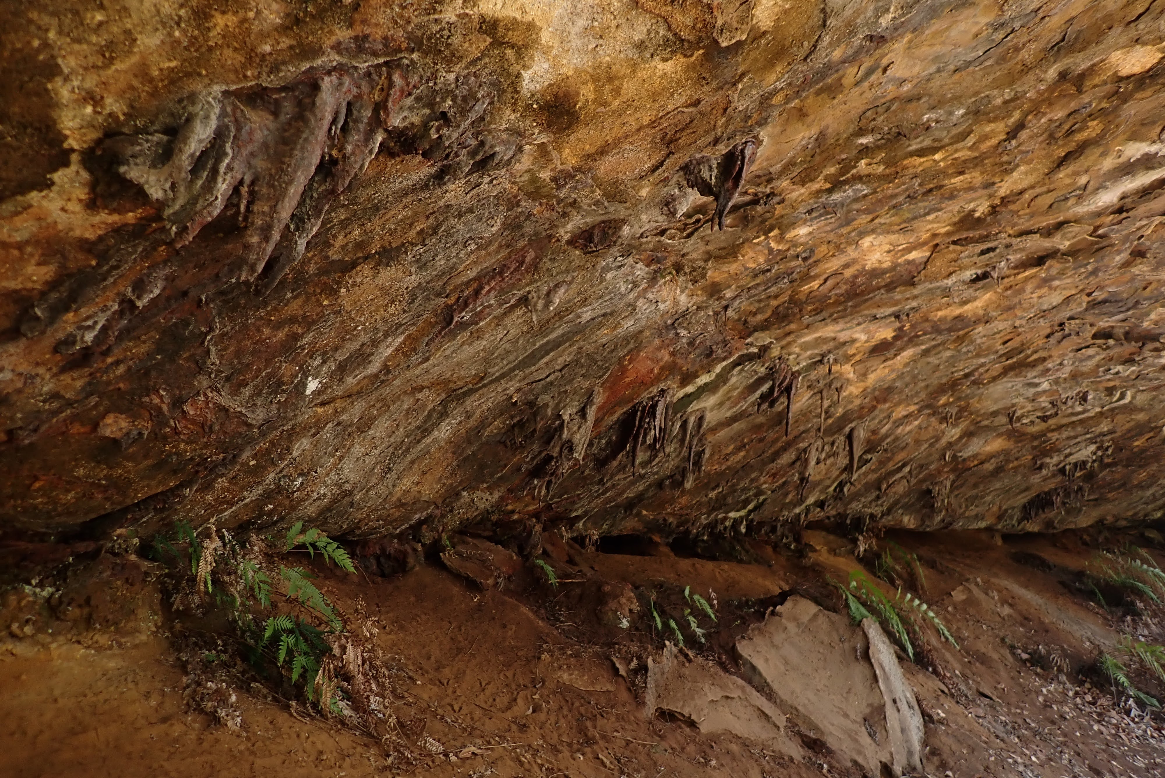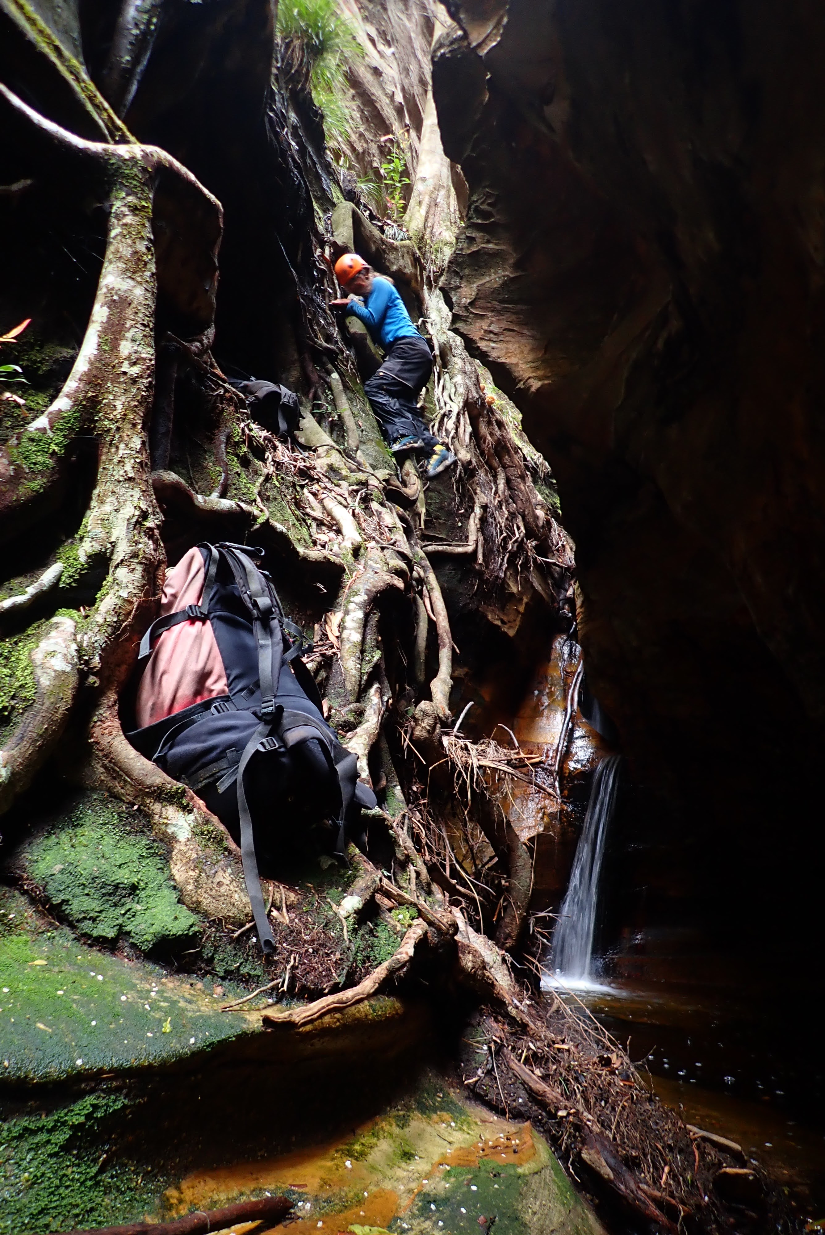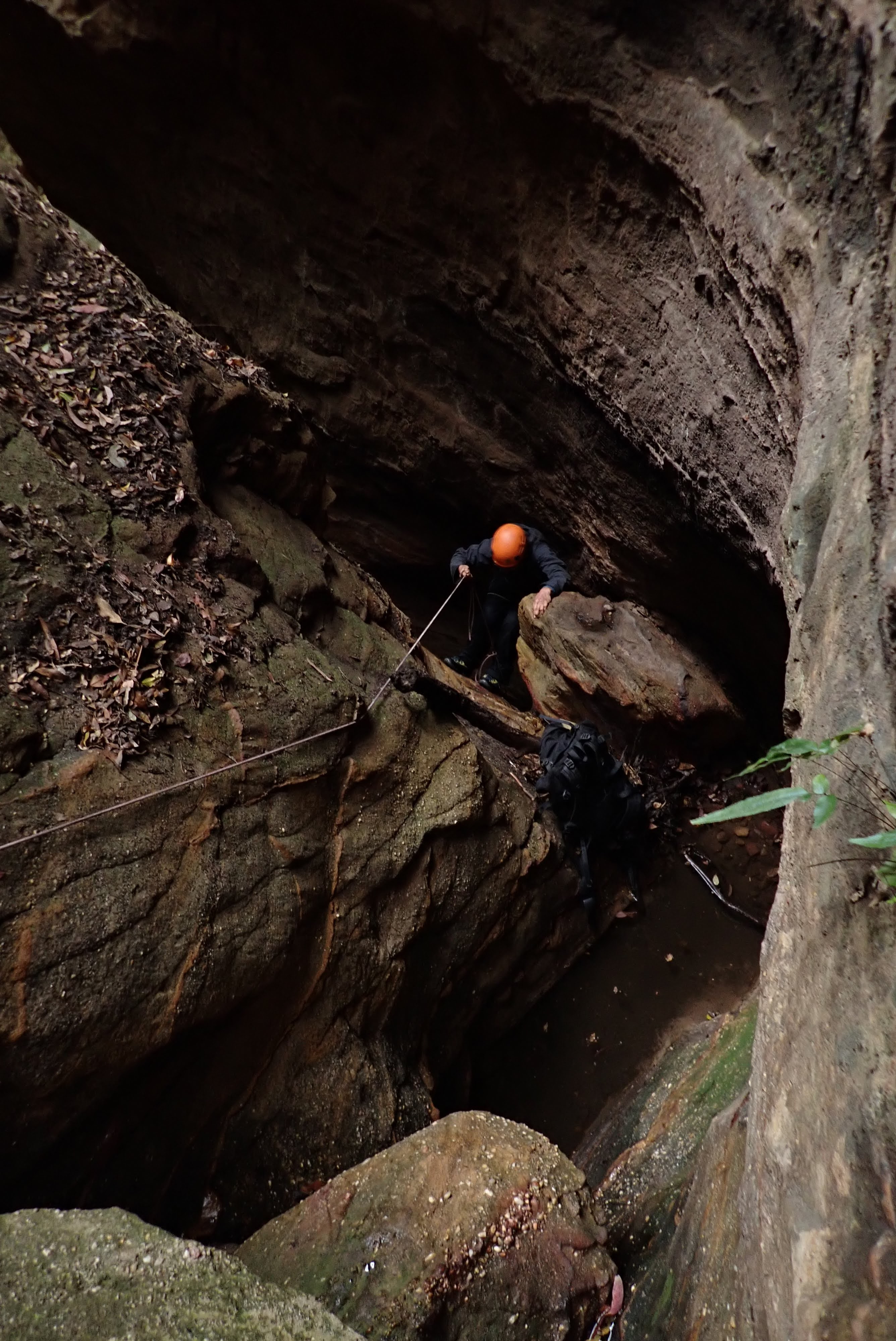 Soon we reached the main creek, admiring the wave shape rock wall upstream. We planned to come down this creek after lunch. Continuing downstream we visited an overhang and kept high soon spying what looked like a possible exit. After some brief discussion (considering it was late and the others probably weren’t waiting for us anymore) we decided to give it a crack. Waterproofing most of our gear and hanging it, we began scrambling up a rough ramp. To get up to the next layer there was a short climb up the side of a convenient boulder that provided a sort of ladder to get up. Thenceforth it was fairly straight forward.