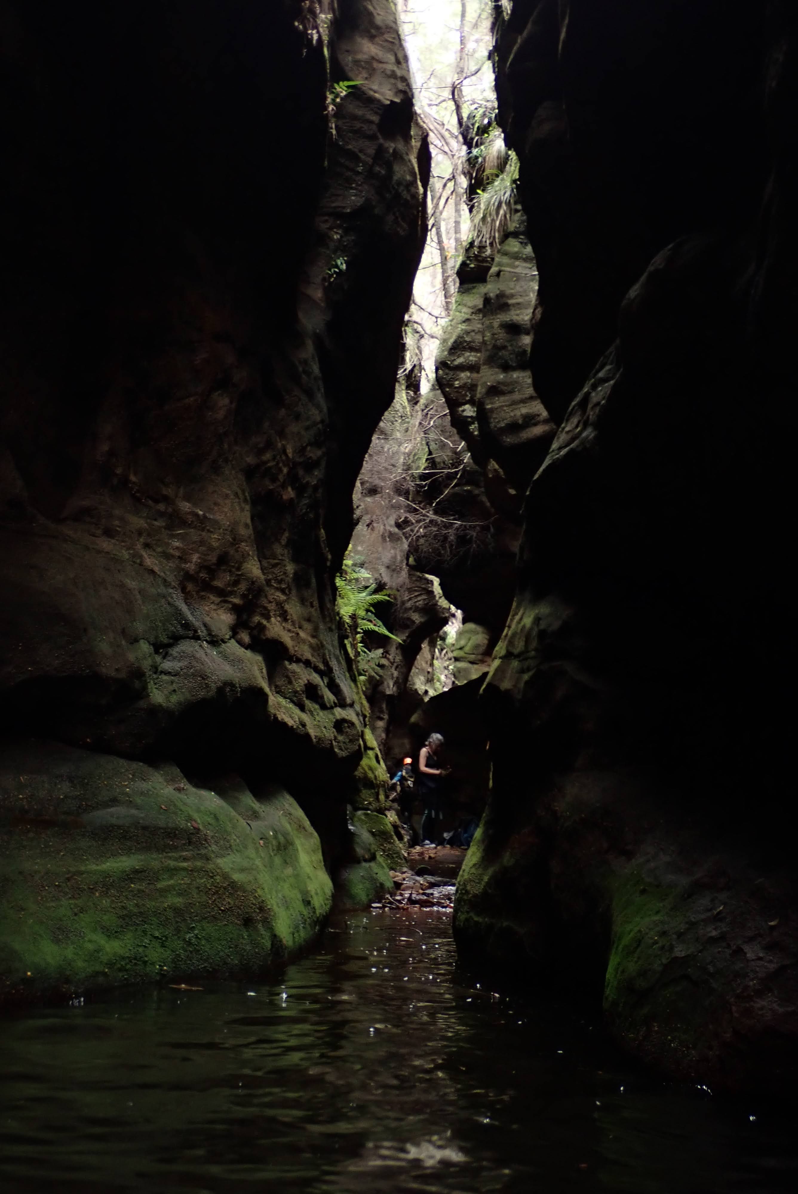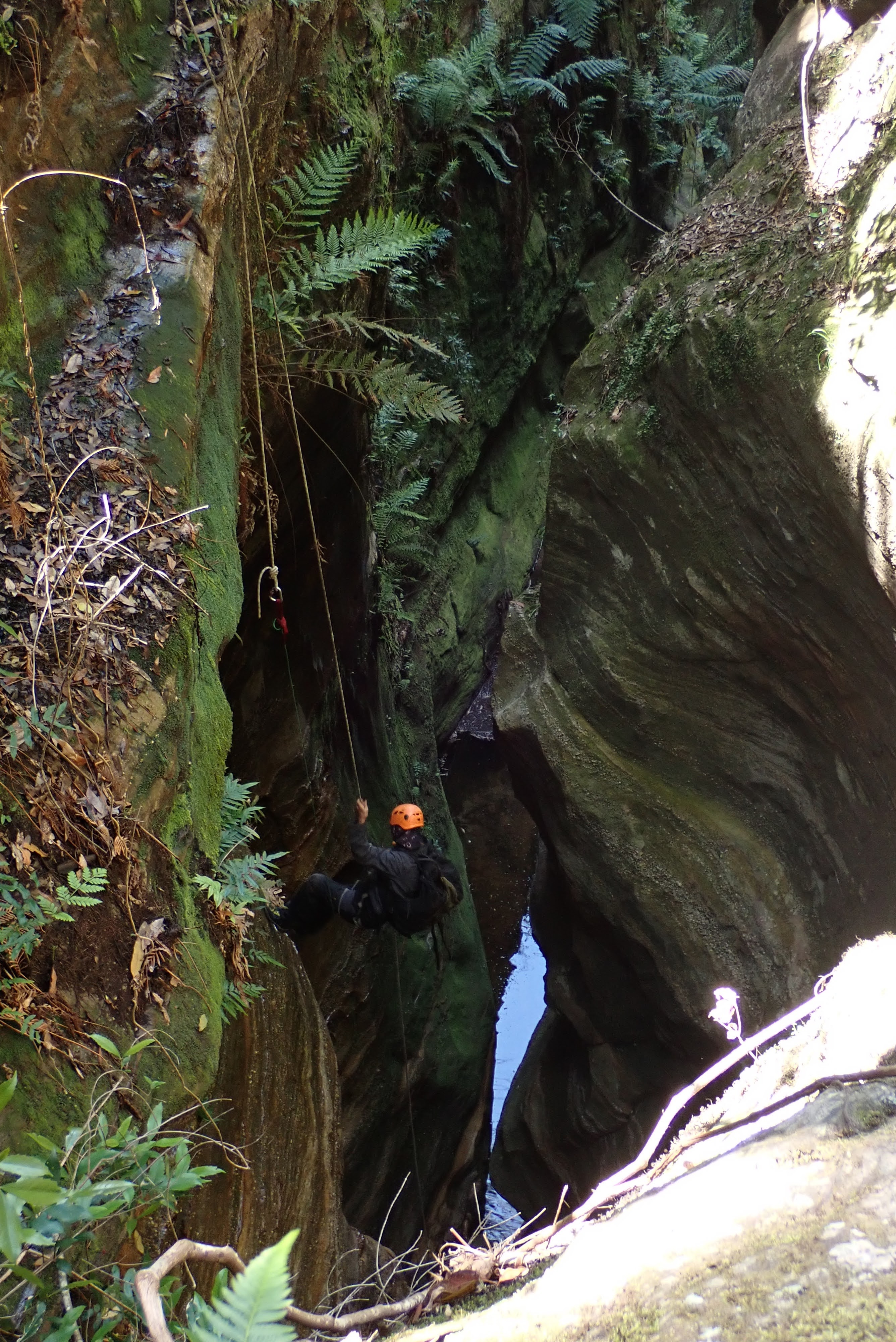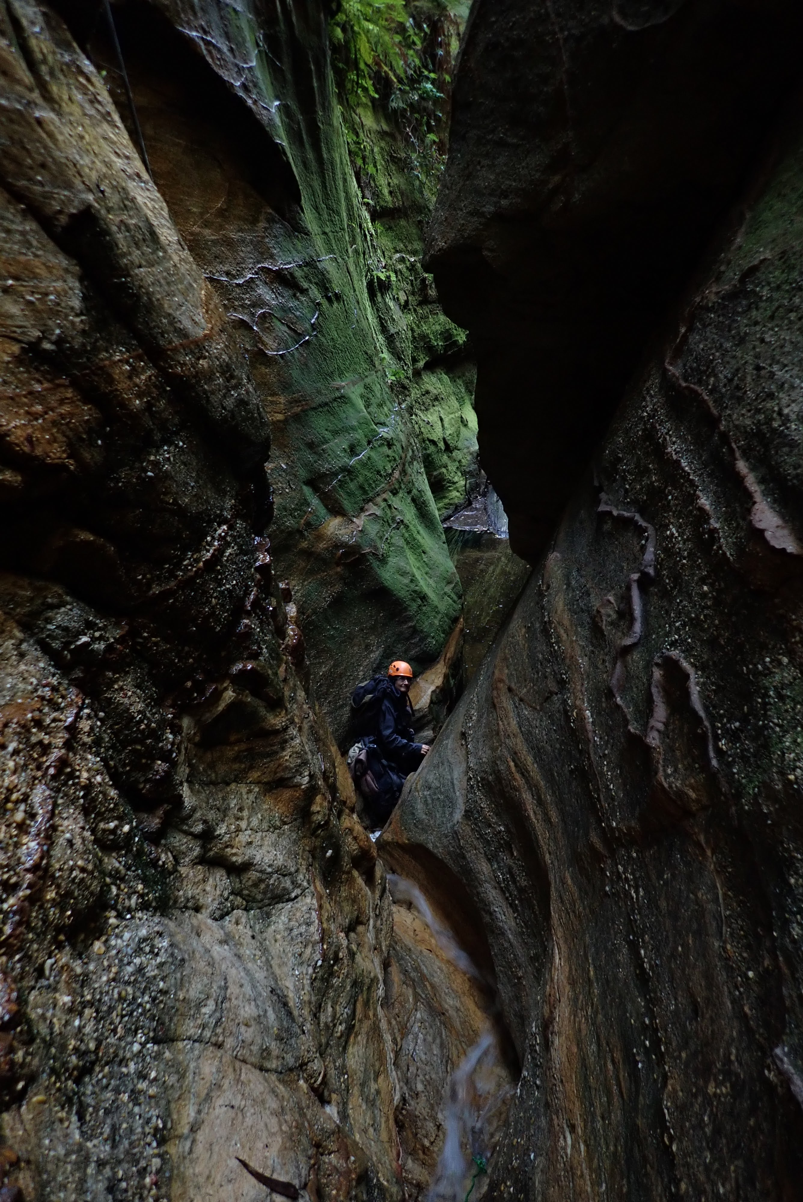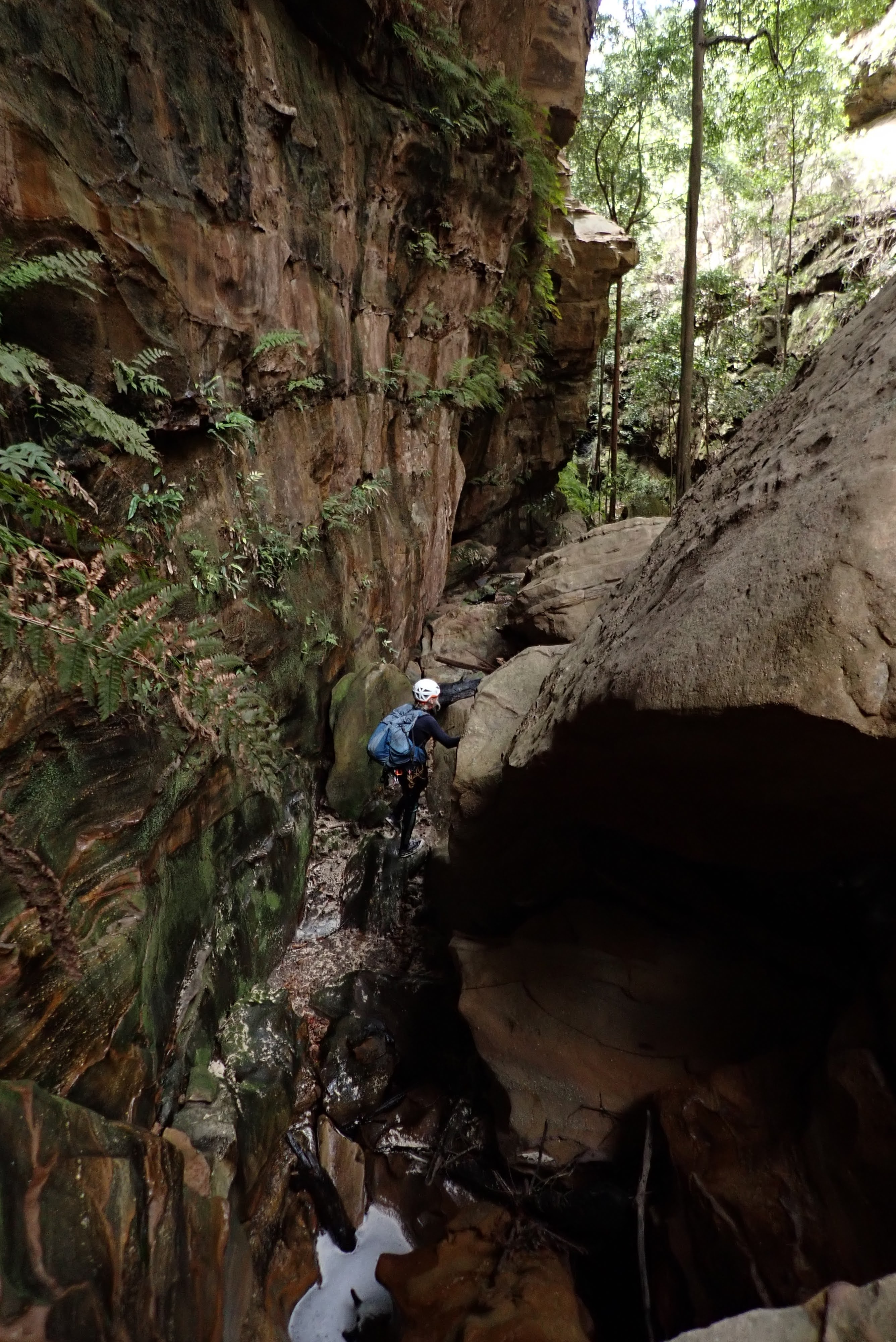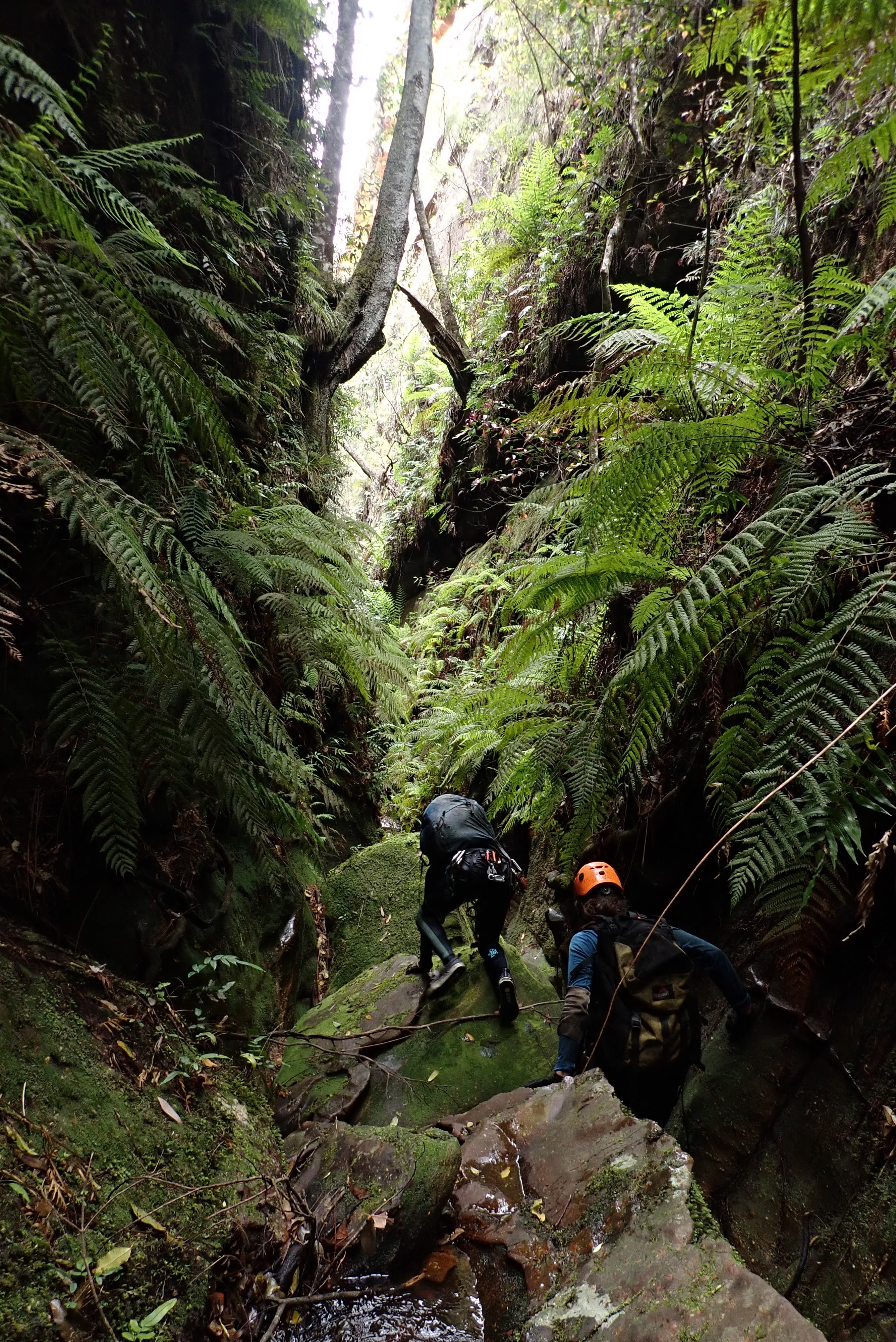 Following the humble creek down, we were surprised when it suddenly dropped into a large amphitheater. Should we abseil in? I was pretty sure you could avoid it. We continued around to the left until mum picked a nice spot for an abseil. Mum rigged it with a toggle and down we went. The previously foreshortened ferns and other vegetation seemed taller as we continued down. The creek narrowed a bit and then dropped into an even narrower slot. Narrow enough that chimneying down was easy enough. Up and over a well and truly stuck chockstone and then mum let me take the lead… It was hard to see, as the canyon again dropped steeply down, this time into a more complete blackness. Jamming myself in, I worked my way down and then out, dropping into some water that wasn’t as deep as expected and stepped gingerly across a deeper section. Passing through a narrow section that clung to my bag we emerged from our cave-like experience.