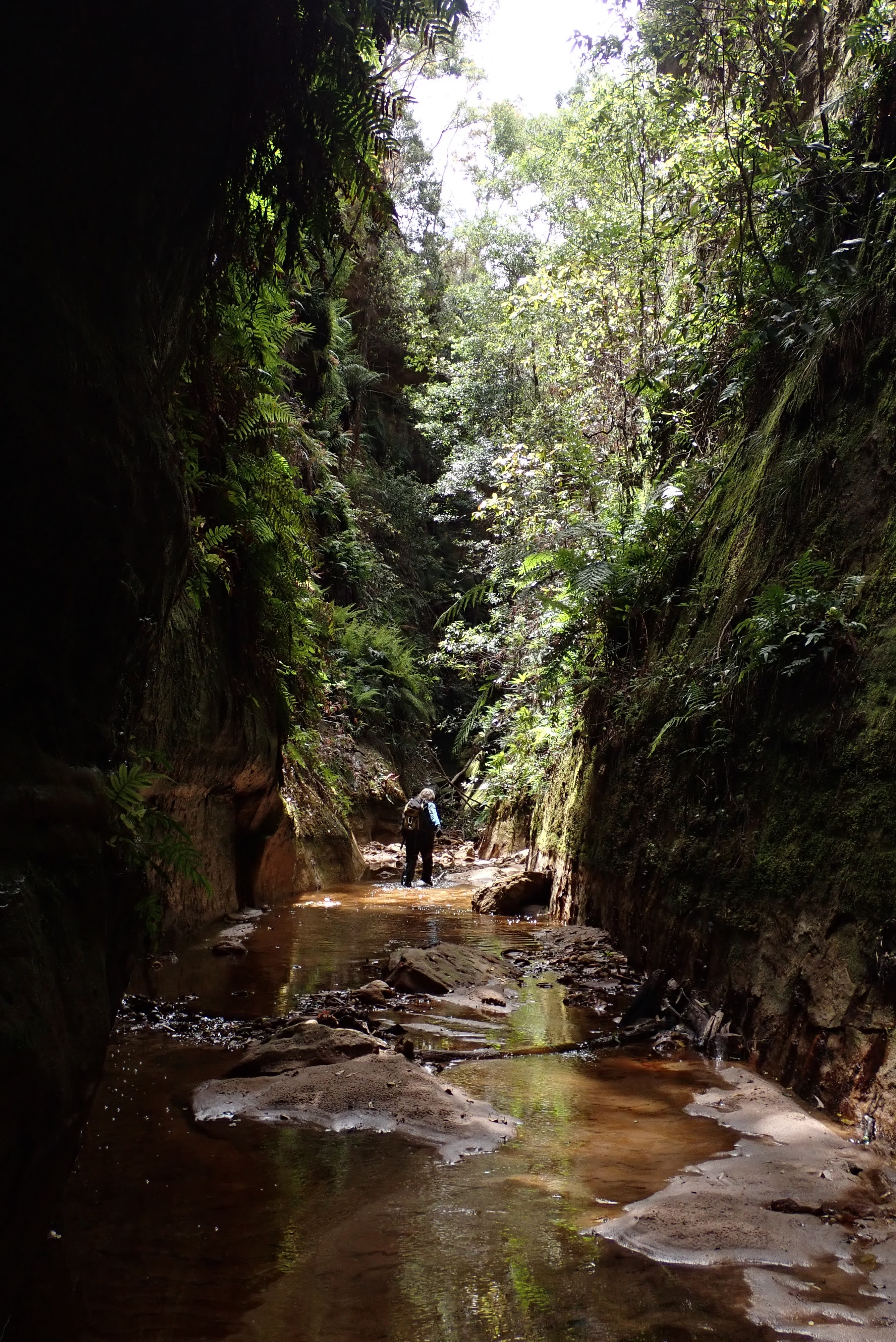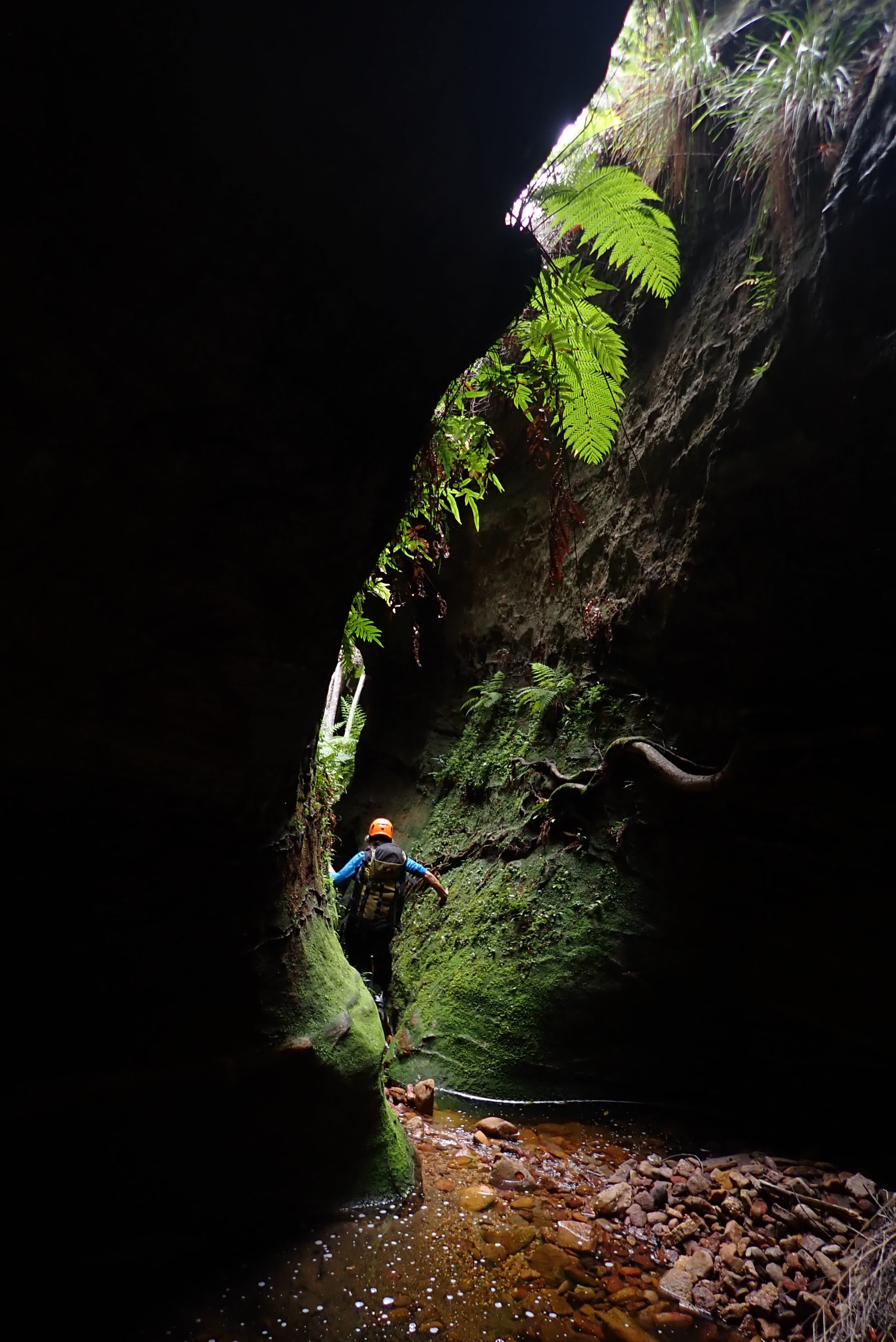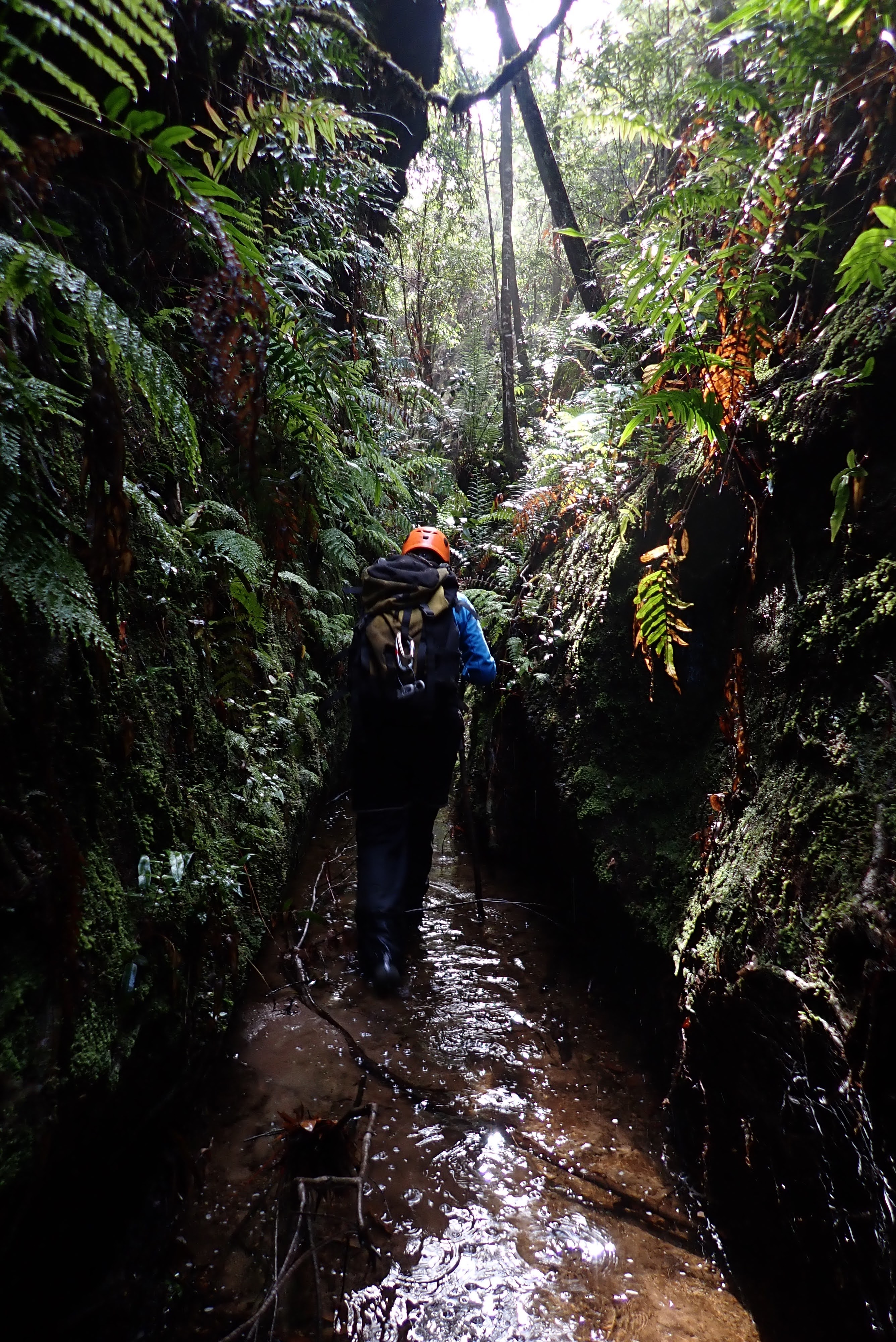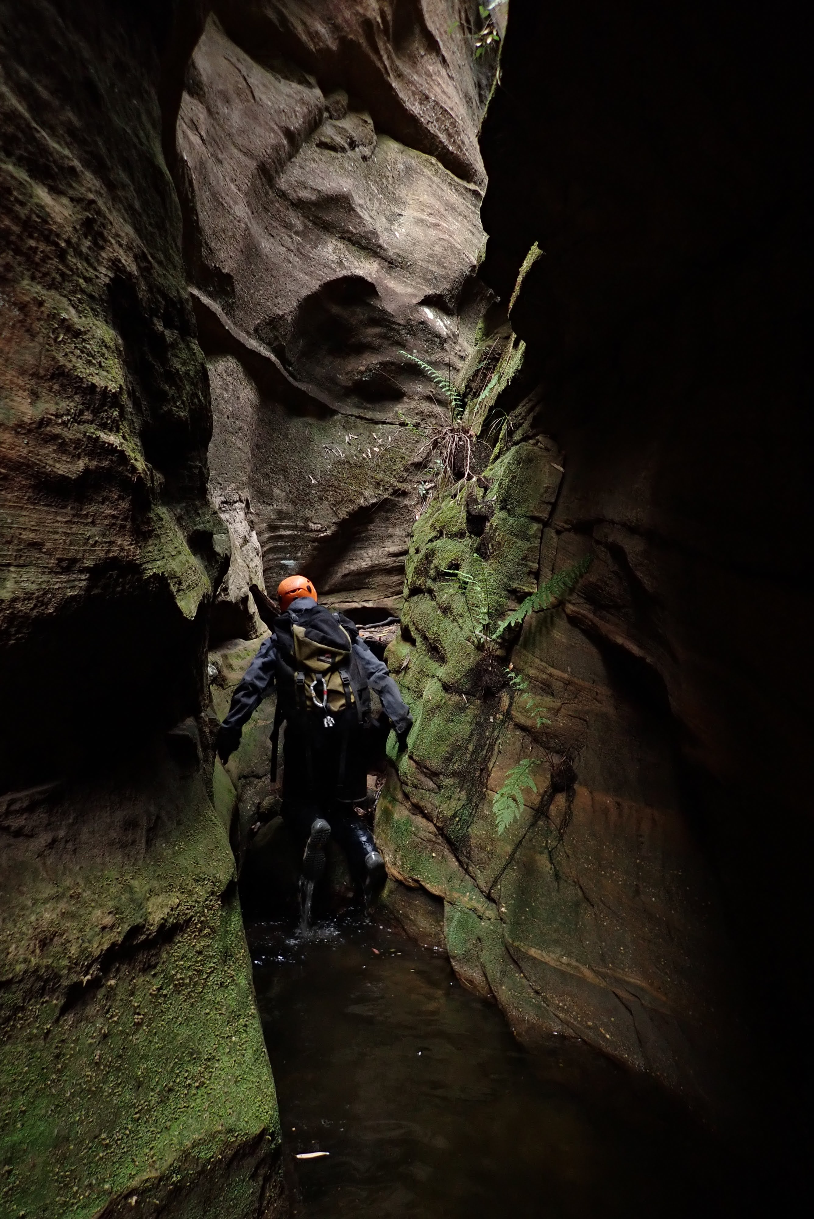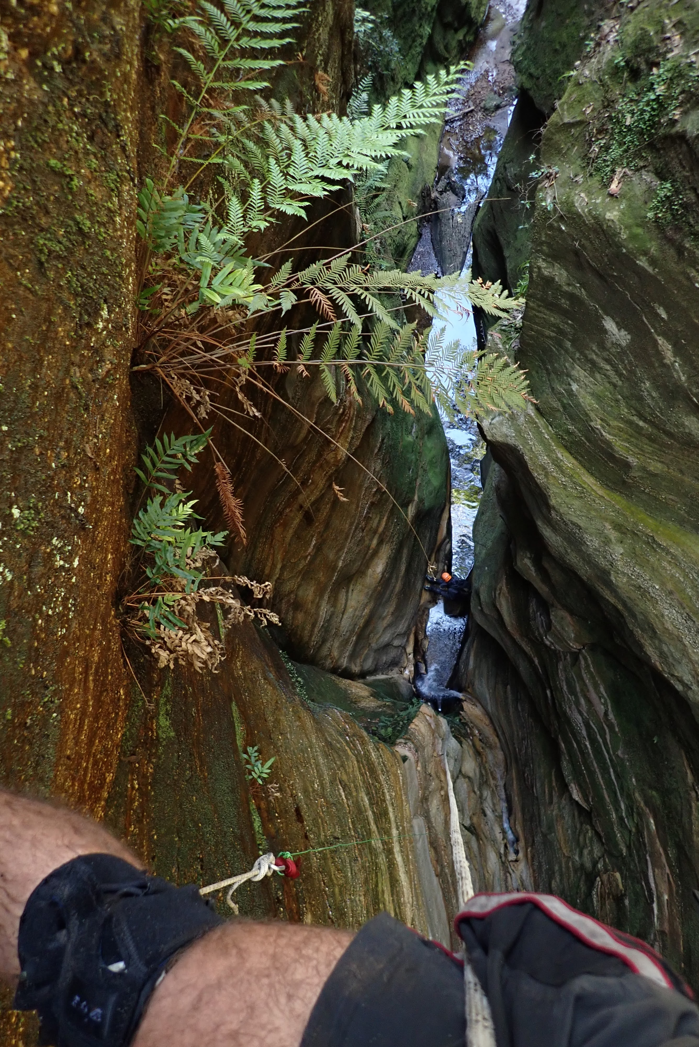 Following the humble creek down, we were surprised when it suddenly dropped into a large amphitheater. Should we abseil in? I was pretty sure you could avoid it. We continued around to the left until mum picked a nice spot for an abseil. Mum rigged it with a toggle and down we went. The previously foreshortened ferns and other vegetation seemed taller as we continued down. The creek narrowed a bit and then dropped into an even narrower slot. Narrow enough that chimneying down was easy enough. Up and over a well and truly stuck chockstone and then mum let me take the lead… It was hard to see, as the canyon again dropped steeply down, this time into a more complete blackness. Jamming myself in, I worked my way down and then out, dropping into some water that wasn’t as deep as expected and stepped gingerly across a deeper section. Passing through a narrow section that clung to my bag we emerged from our cave-like experience.