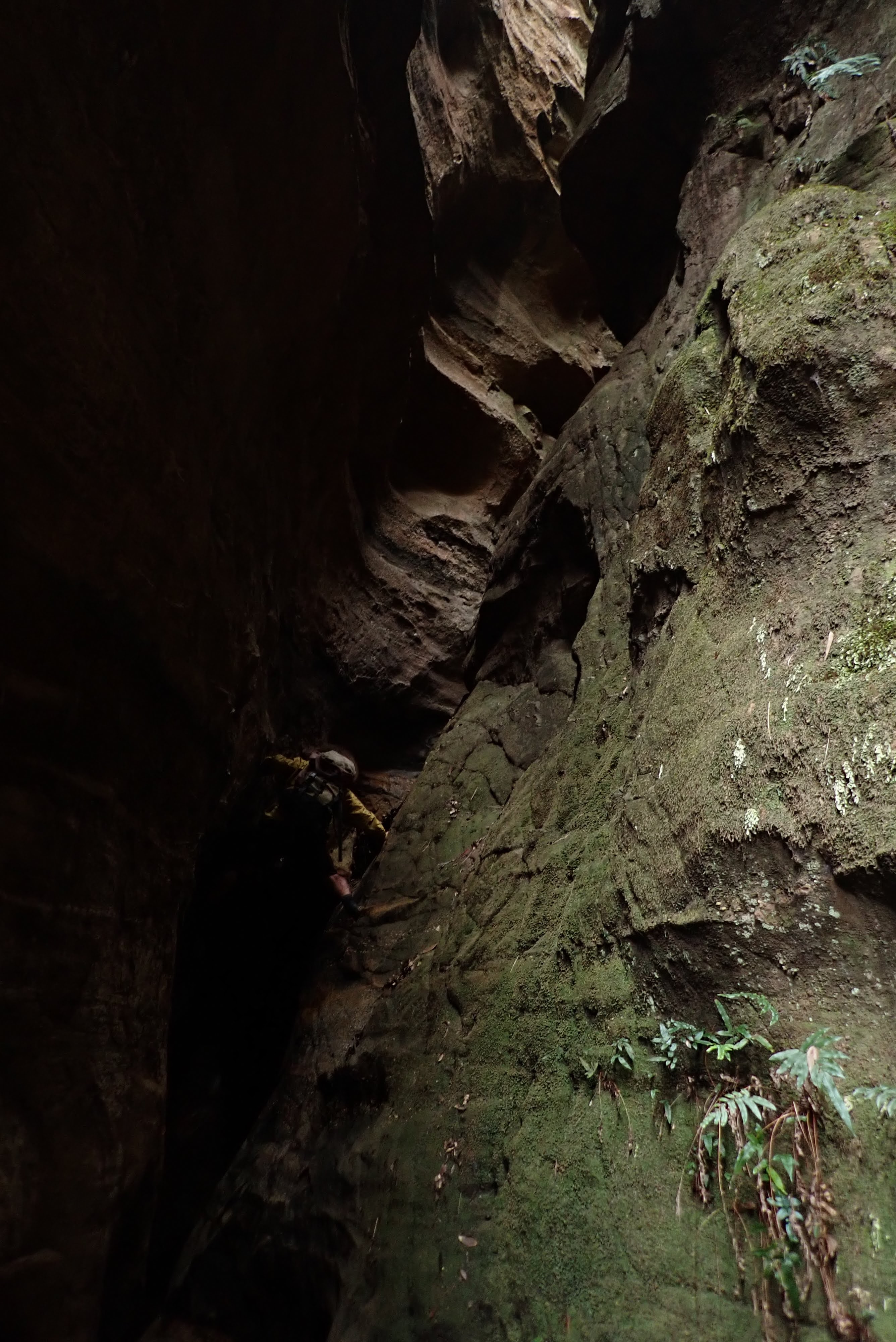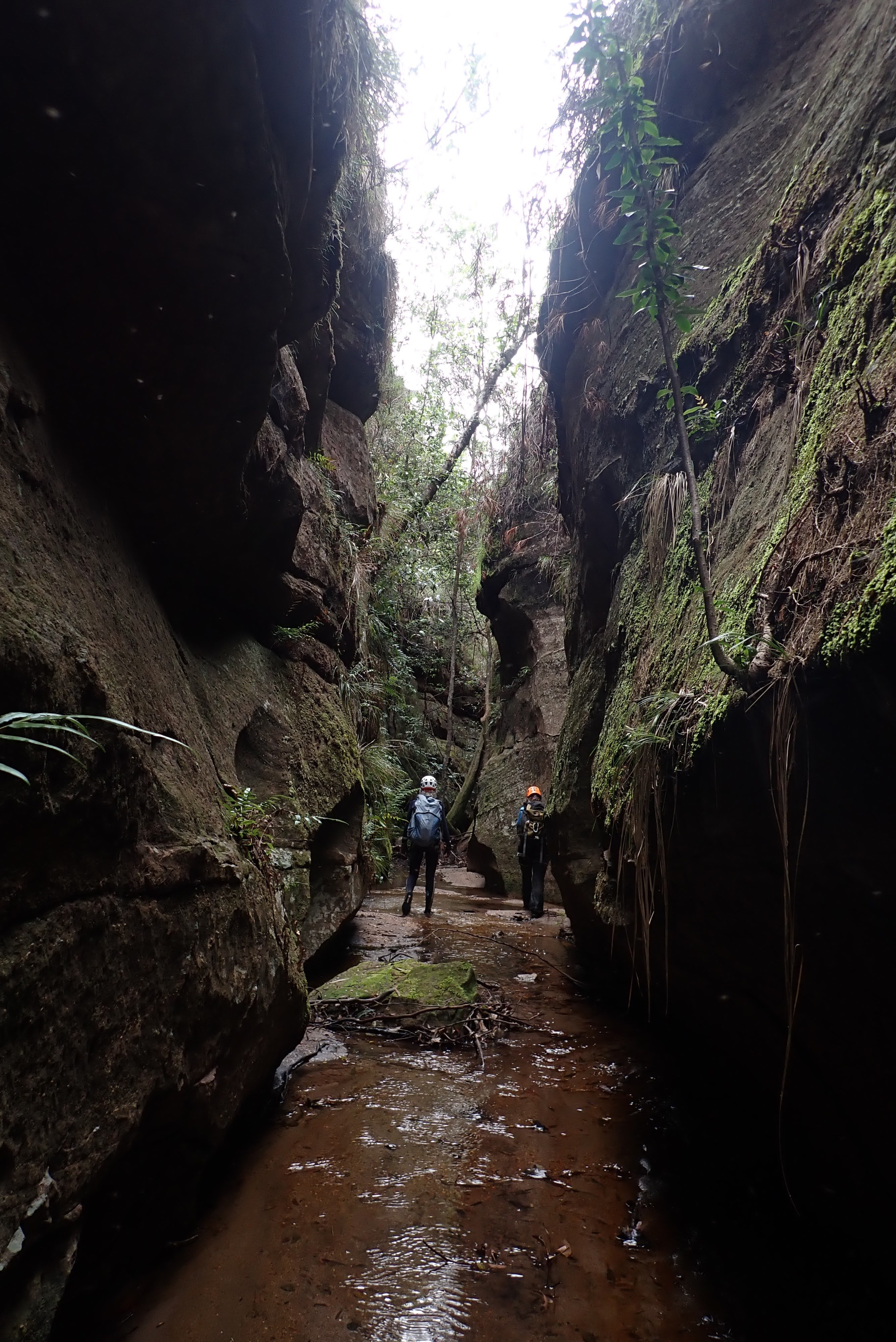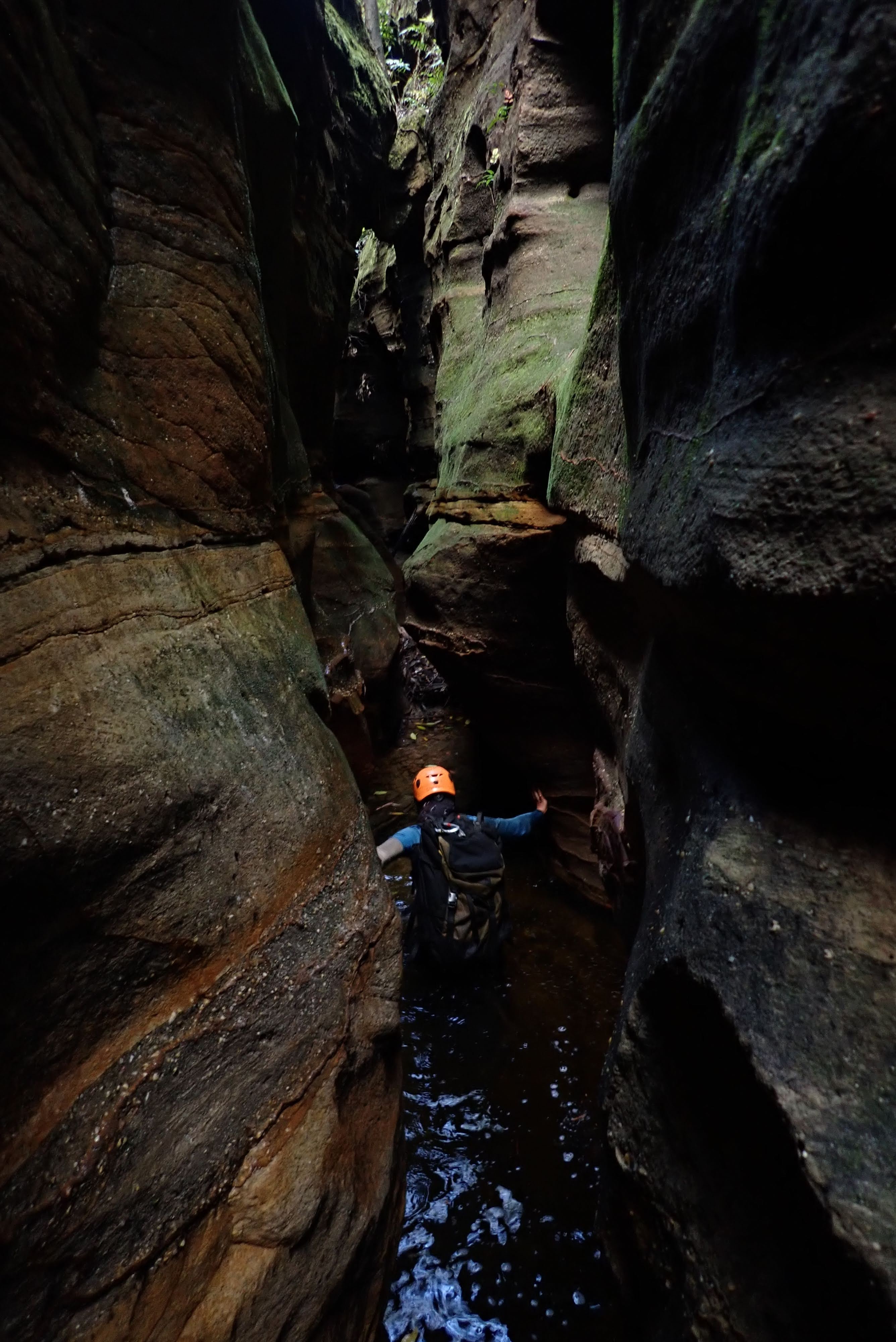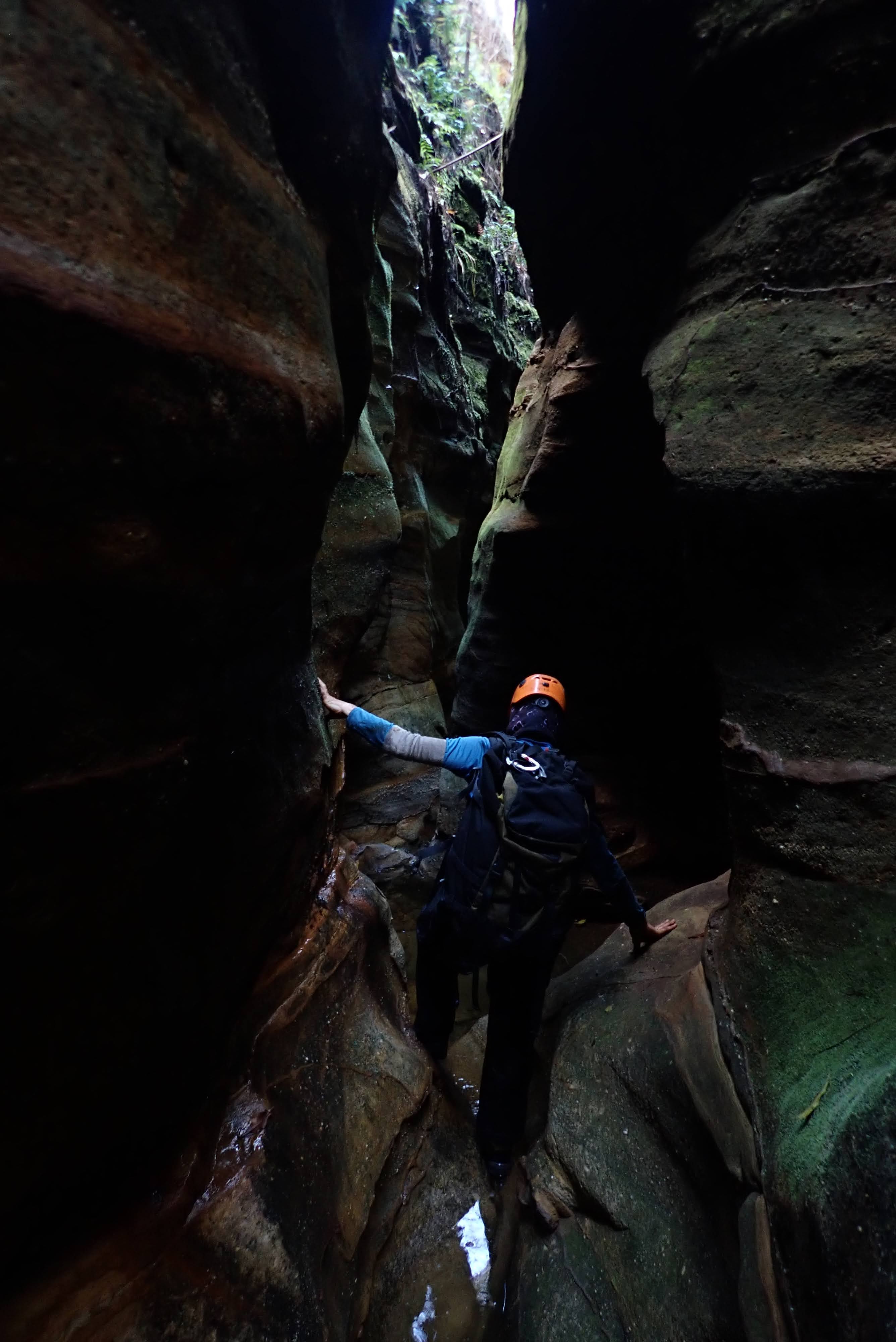 Following the humble creek down, we were surprised when it suddenly dropped into a large amphitheater. Should we abseil in? I was pretty sure you could avoid it. We continued around to the left until mum picked a nice spot for an abseil. Mum rigged it with a toggle and down we went. The previously foreshortened ferns and other vegetation seemed taller as we continued down. The creek narrowed a bit and then dropped into an even narrower slot. Narrow enough that chimneying down was easy enough. Up and over a well and truly stuck chockstone and then mum let me take the lead… It was hard to see, as the canyon again dropped steeply down, this time into a more complete blackness. Jamming myself in, I worked my way down and then out, dropping into some water that wasn’t as deep as expected and stepped gingerly across a deeper section. Passing through a narrow section that clung to my bag we emerged from our cave-like experience.